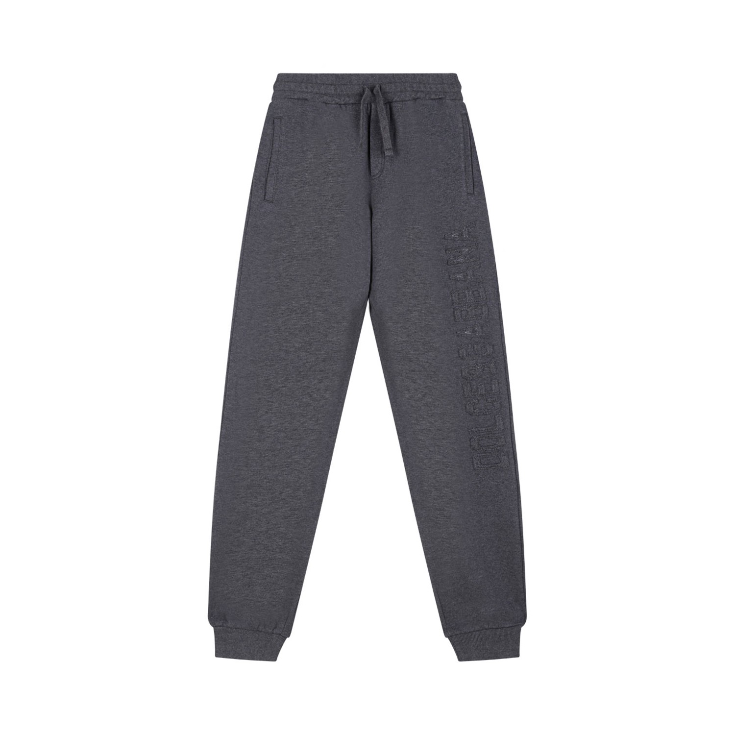 Dolce & Gabbana Kids Melange Grey Embroidered Logo Trousers. Melange grey cotton trousers with elasticated waistband, cuffed hems, side pockets. Embroidered logo and back pocket.