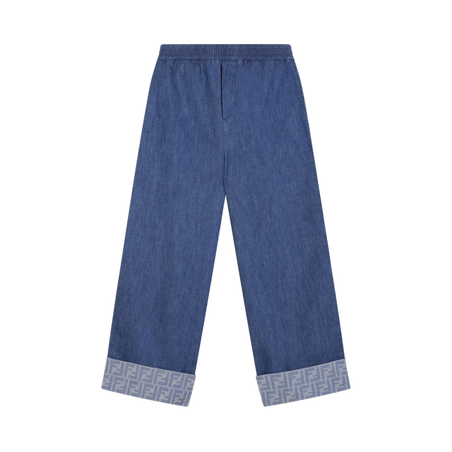 Fendi Kids Blue Lightweight Denim Trousers. Blue loose-fitting junior trousers in lightweight denim, with elasticated waistband and tone-on-tone FF logo on the turn-ups.