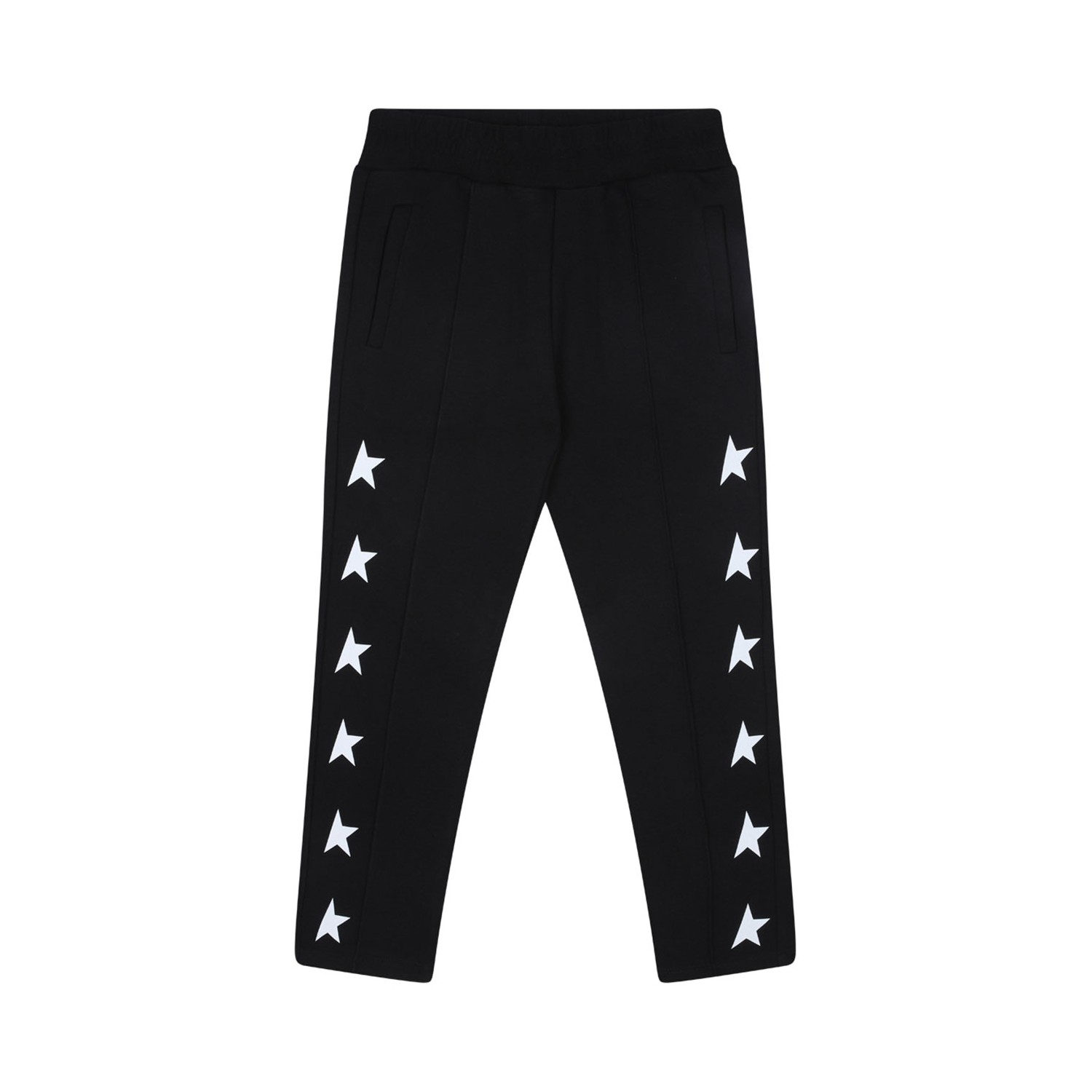 Golden Goose Kids Black Track Pants. Black cotton blend track pants, jersey texture, seam detailing. Elasticated waistband, two front welt pockets, rear patch pocket.