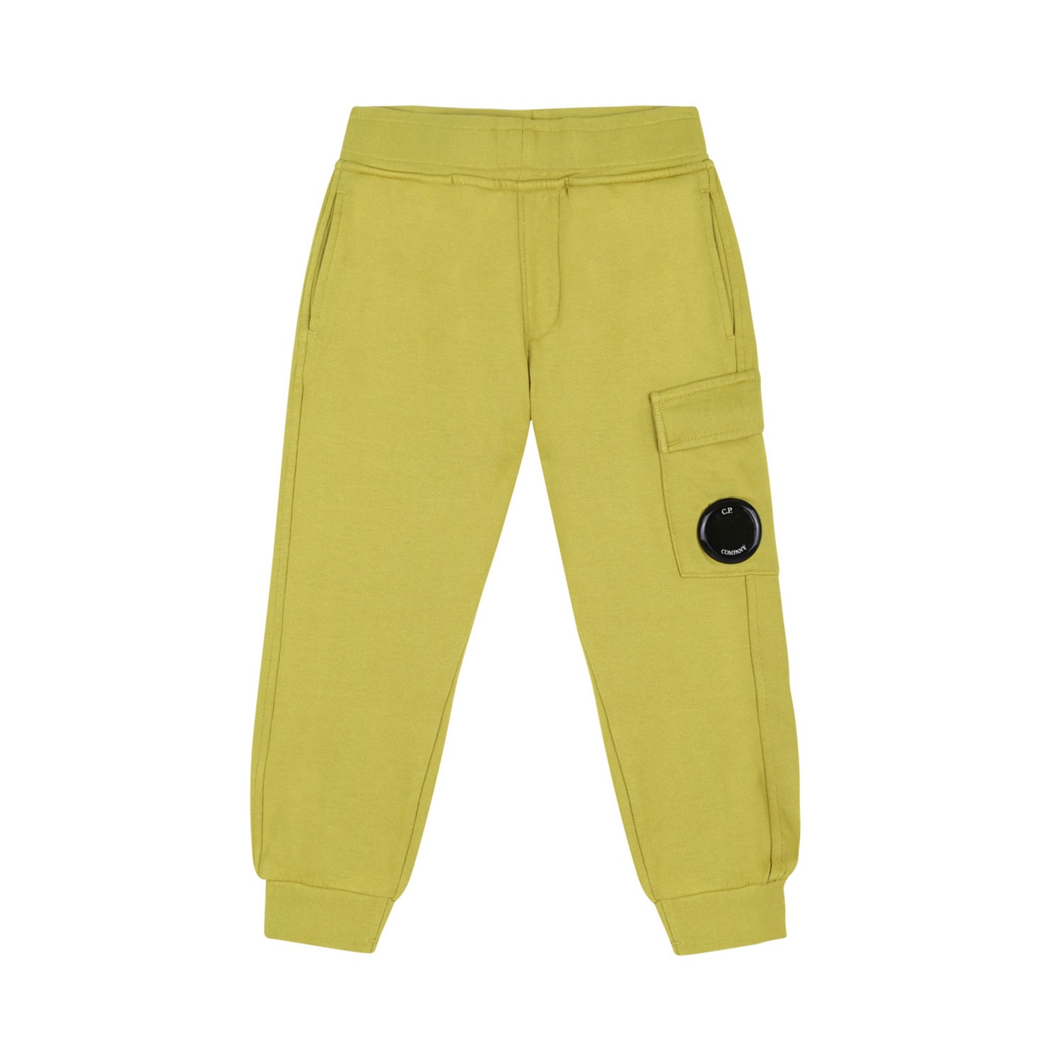 C.P. Company Kids Cypress Green Track Sweatpants. Cypress green cotton track sweatpants, elasticated waistband, two front pockets, one cargo pocket with logo patch.