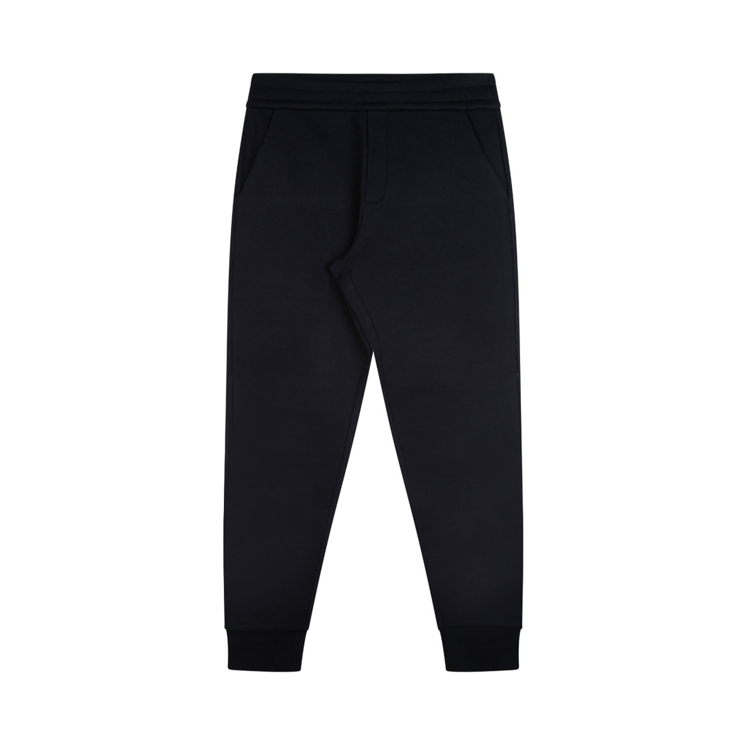 Moncler Kids Navy Blue Trousers. Navy blue cotton trousers, back logo in contrasting colour, grosgrain label on the rear, elasticated waist band, two front pockets.