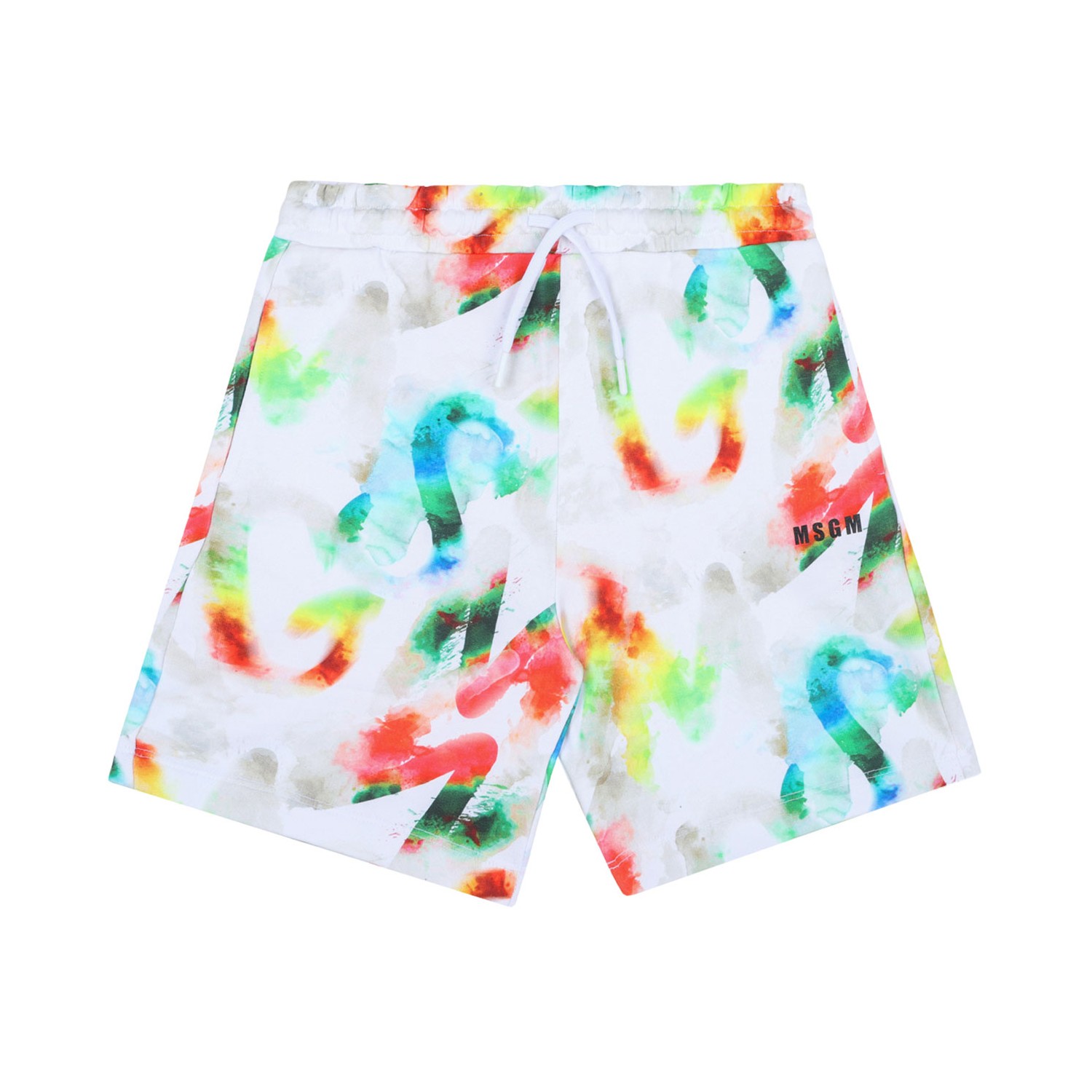 MSGM Kids Multicolour Shorts. White and multicolour cotton short, jersey texture, watercolour effect, logo print to the front. Elasticated drawstring waistband, two side slit pockets.
