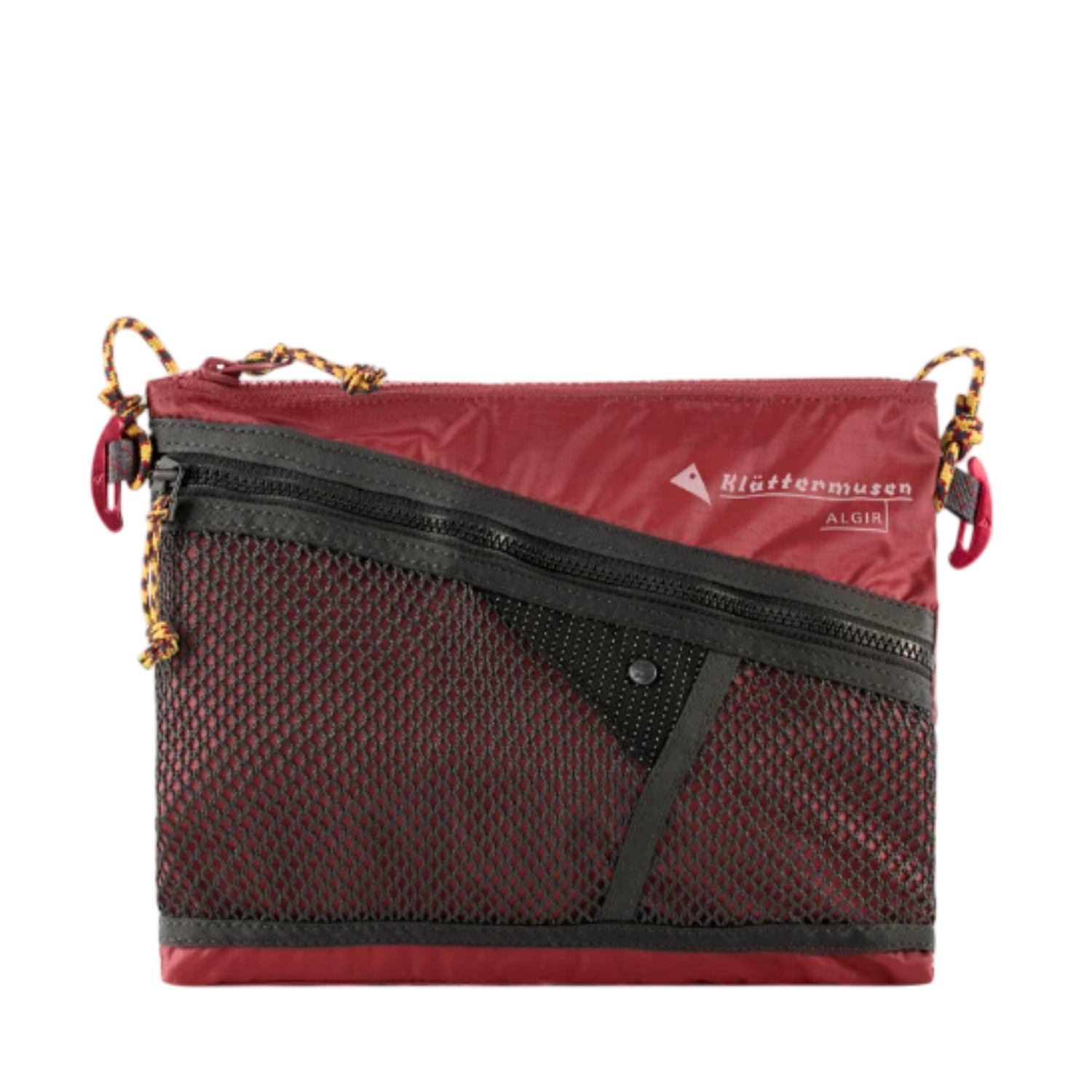 Klattermusen Algir Medium Accessory Bag. Brunt russet accessory bag in medium is your perfect organizer for smaller items. A small and durable accessory bag that can be used for organizing personal items or as an accessory to your backpack, attached with toggles. Algir features an adjustable cord that can be used to hang the bag over your shoulder or around the neck to use as a tote bag, and an outside mesh pocket.