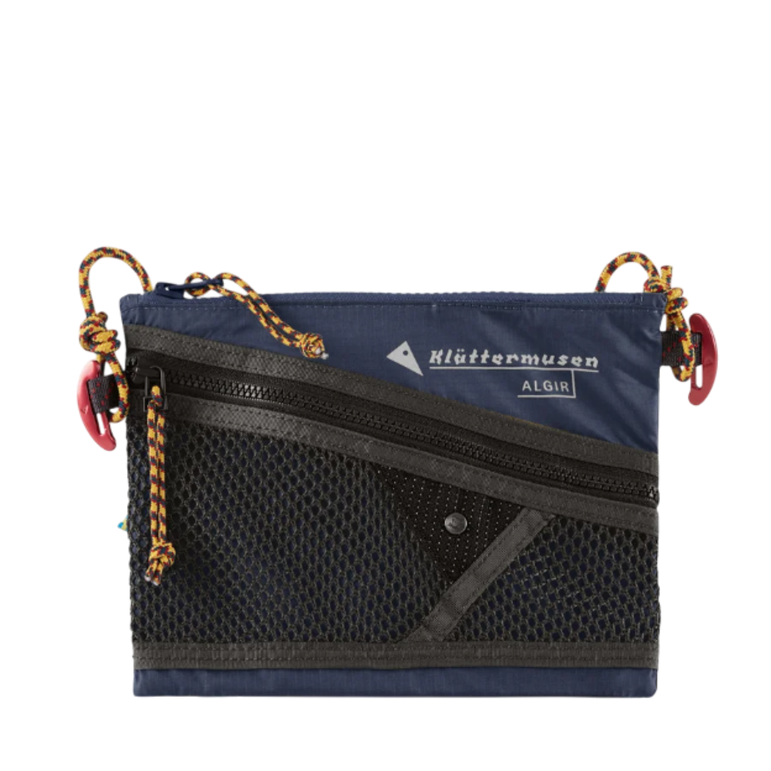 Klattermusen Algir Small Accessory Bag. Indigo blue accessory bag in small is your perfect organizer for smaller items. A small and durable accessory bag that can be used for organizing personal items or as an accessory to your backpack, attached with toggles. Algir features an adjustable cord that can be used to hang the bag over your shoulder or around the neck to use as a tote bag, and an outside mesh pocket.