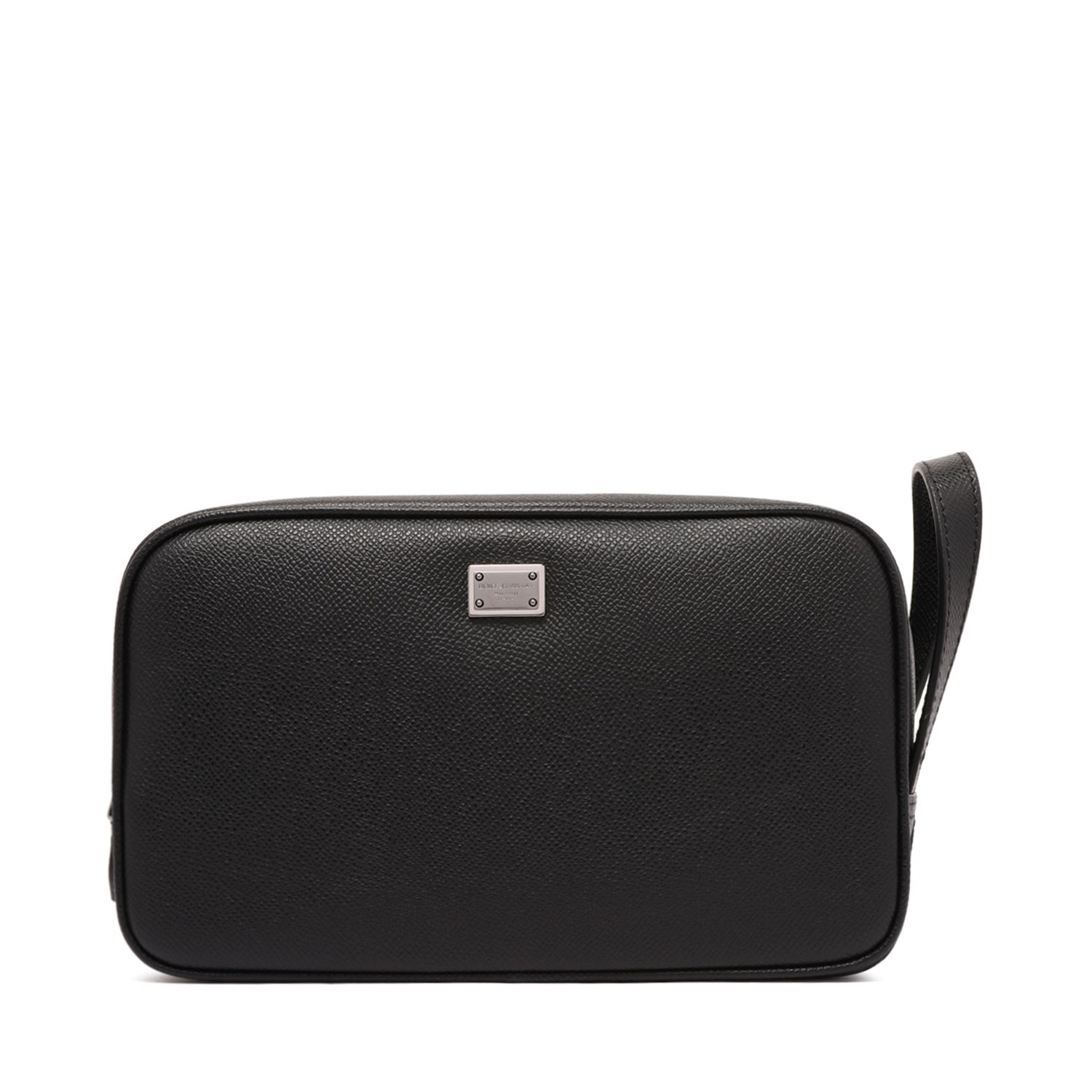 Dolce & Gabbana Black Alpine Calfskin Necessaire. Black Alpine calfskin necessaire with leather handles, zip closure, ruthenium electroplating. External customization with bigalvanic plate, internal customization with stamp with film, interior zip pocket.