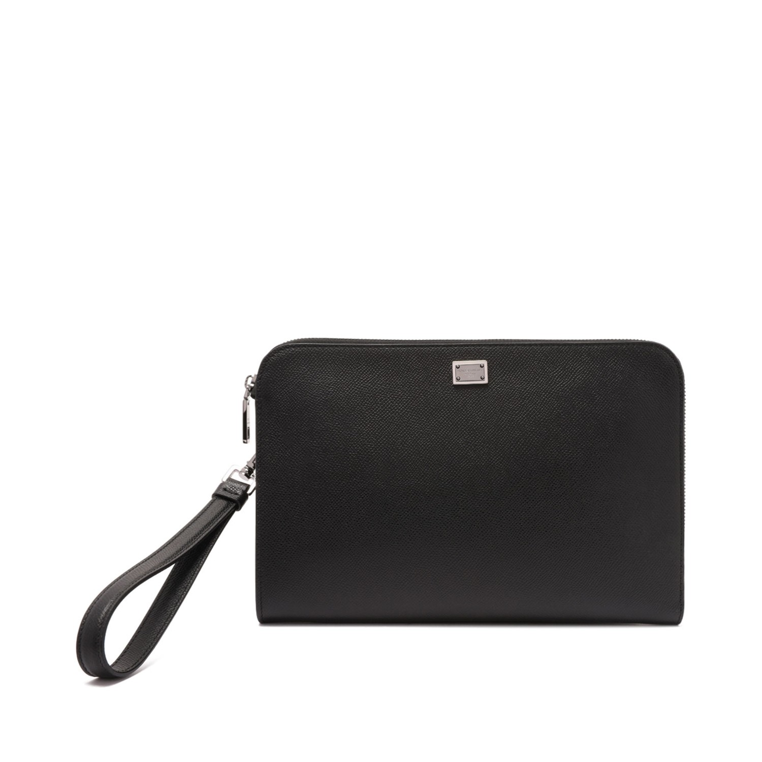 Dolce & Gabbana Black Alpine Calfskin Sicily Clutch Bag. Black Alpine calfskin clutch with leather handles, ruthenium electroplating zip closure. External customization with bigalvanic plate, internal customization with stamp and film, interior with flat pocket.