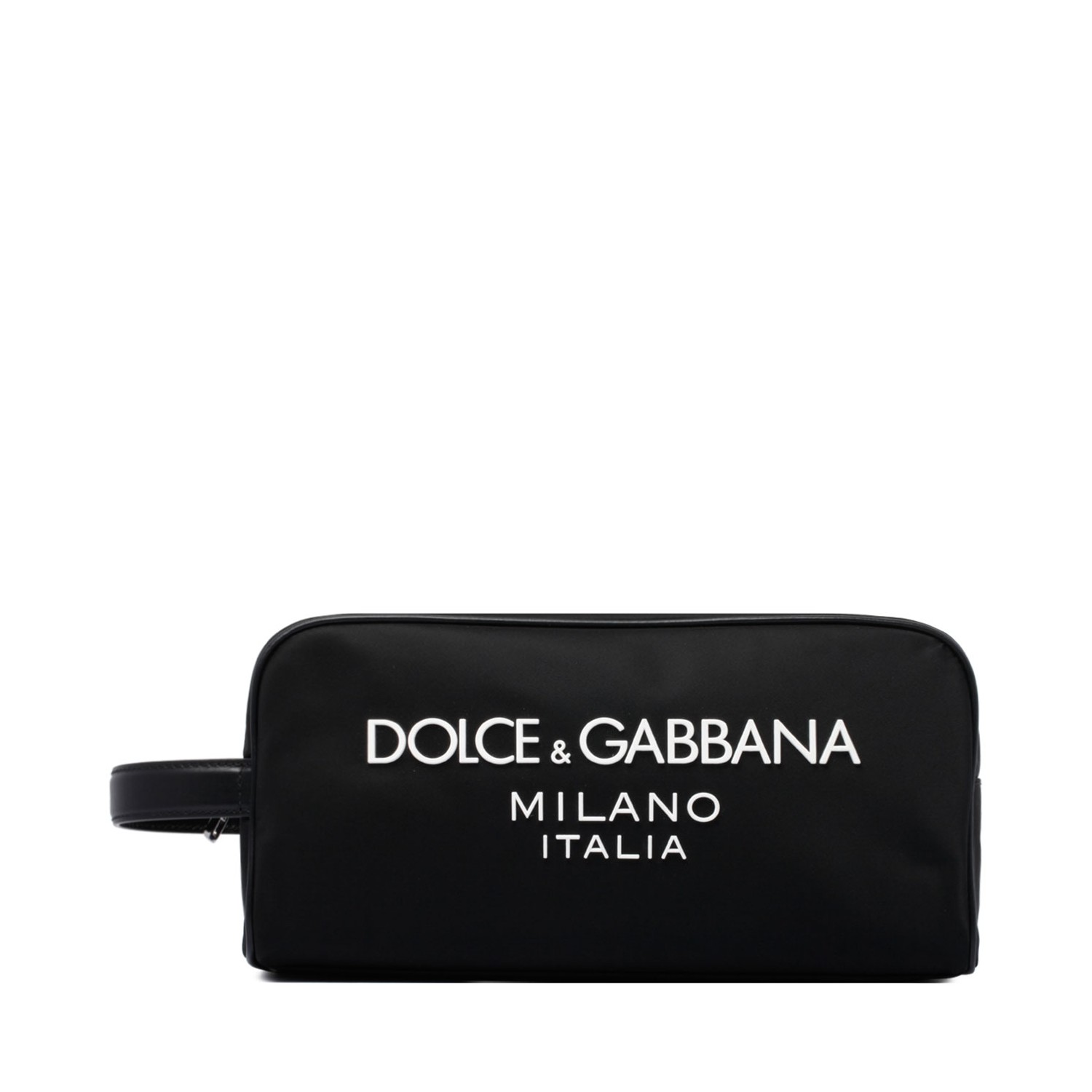 Dolce & Gabbana Black Beauty Case. Beauty case made of black nylon with smooth leather details in the same tone. Featuring ruthenium-colored metal, zip closure and side handle. The interior lined in black nylon features a zip pocket. The unmistakable contrasting rubberized lettering logo on the front completes the design.