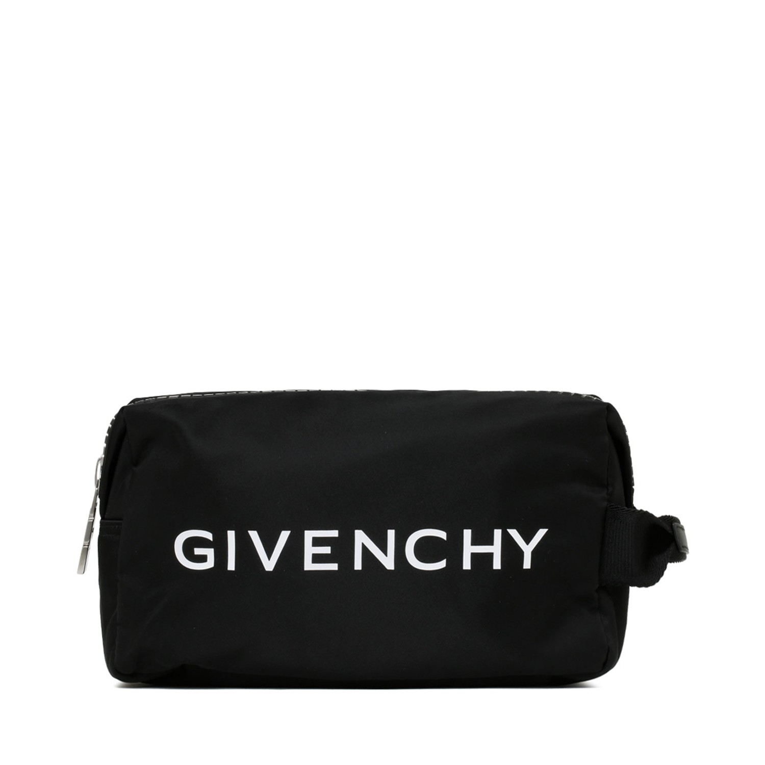 Givenchy Black G-Zip Toilet Pouch. Black pouch in nylon with 4G zip, G-Zip line, one strap on the side, Givenchy signature printed on the front. 4G zipper closure, silvery finish metal details, one main zipped compartment and two mini flat pockets inside.