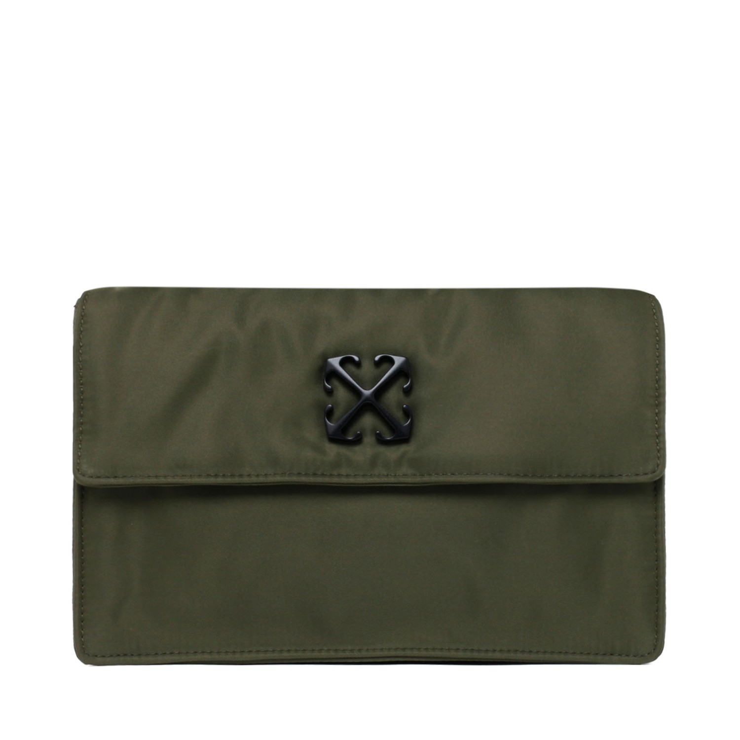 Off White Military Green Jitney 1.4 Shoulder Bag. Military green slouch body shoulder bag, single detachable top handle, foldover top with magnetic fastening, signature Arrows motif. Main compartment, internal zip fastening pocket, detachable shoulder strap, silver tone hardware.