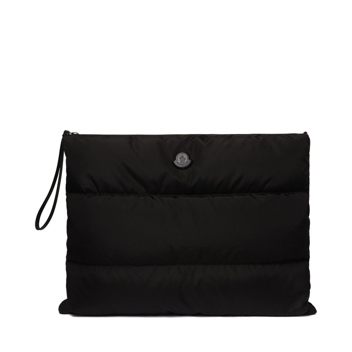 Moncler Black Padded Laptop Pouch. Black nylon laptop pouch, zip-around top closure, padded quilted design. Tonal wrist strap, front logo patch.