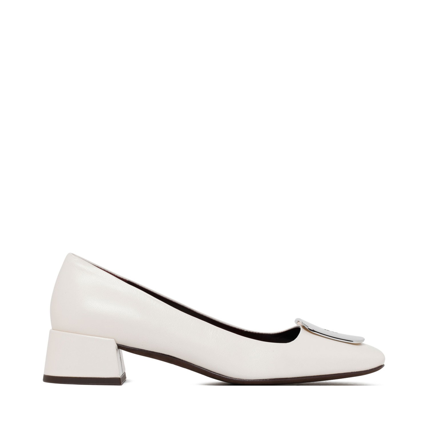 Tory Burch Light Cream Georgia Pump. Light cream leather upper pump, metal logo plate, cushioned leather footbed, nappa leather lining, buffed leather sole.
