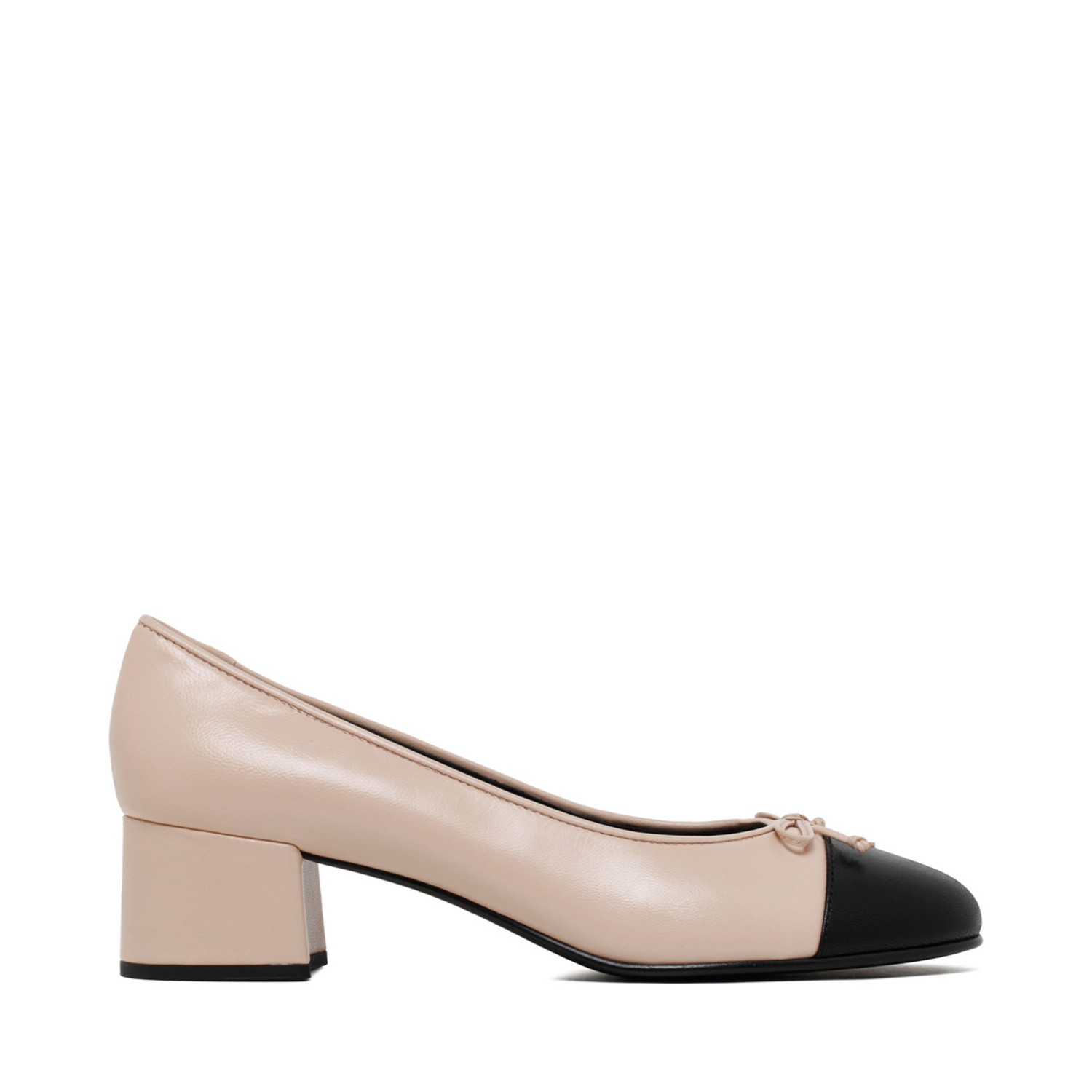 Tory Burch Rose Pink Cap Toe Pump. Rose pink fine leather pump, contrast cap toe and comfortable block heel. Finished with a delicate bow and subtle Double T, napa leather lining, buffed leather sole.