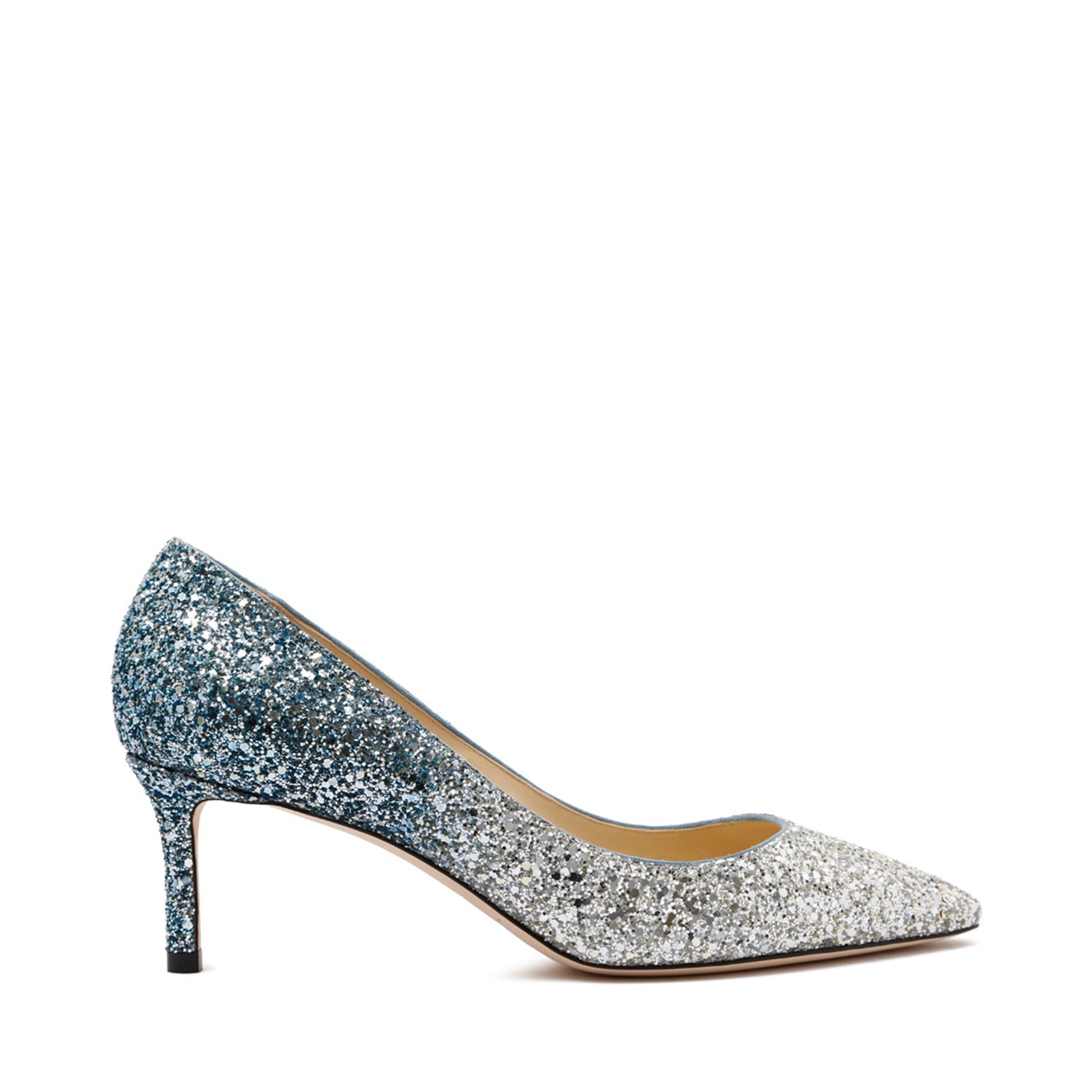 Jimmy Choo Coarse Glitter Fabric Pointed Pumps. Coarse glitter fabric pointed pumps with mid heel, leather lined and leather sole.