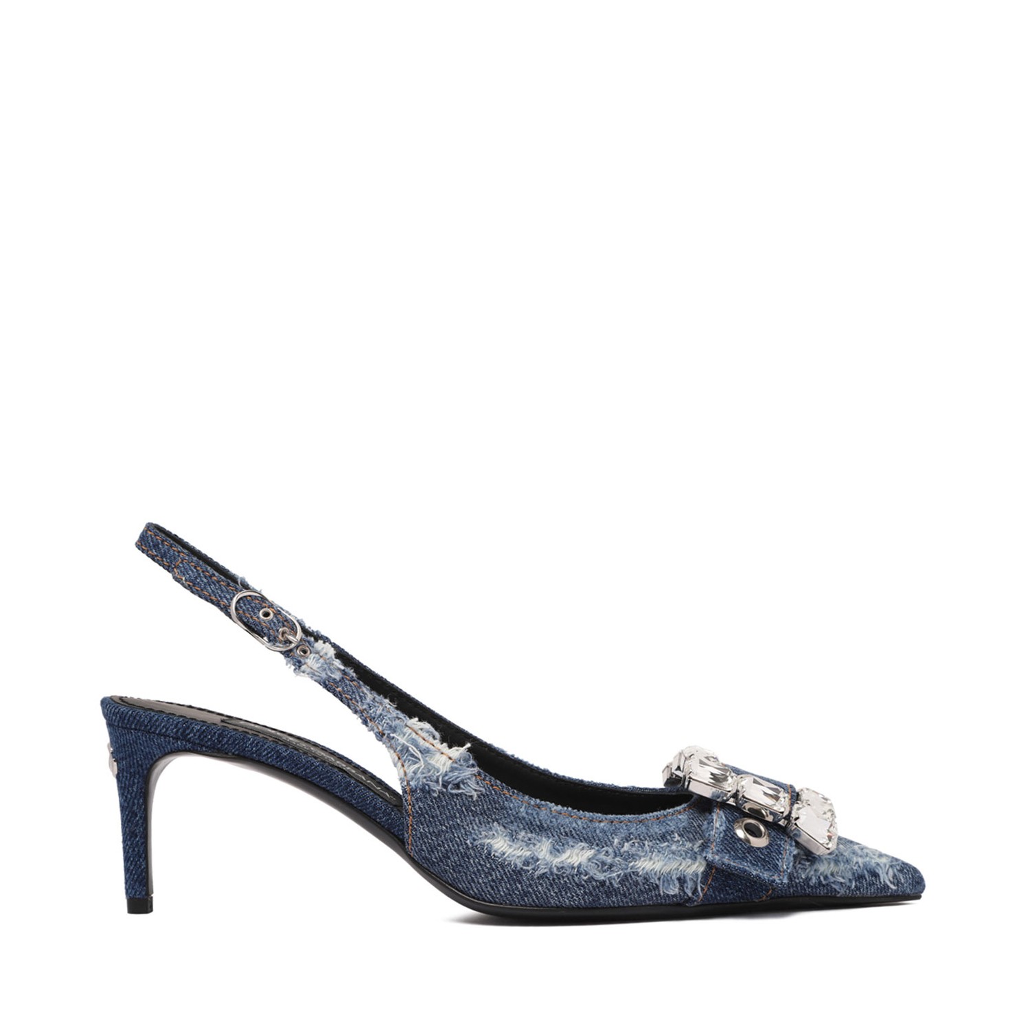 Dolce & Gabbana Blue Denim Slingback Pumps. Blue denim slingback pumps, leather, distressed effect, silver-tone logo plaque. Buckle detail at the toe, crystal embellishment, pointed toe, buckle-fastening ankle strap. Branded insole, stiletto heel.