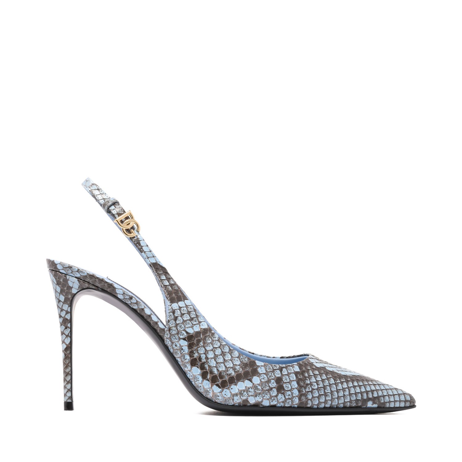 Dolce & Gabbana Light Blue Python Slingback. Light blue pthon slingback with DG logo, 90 mm heel, goatskin insole with logo label, logoed leather sole.