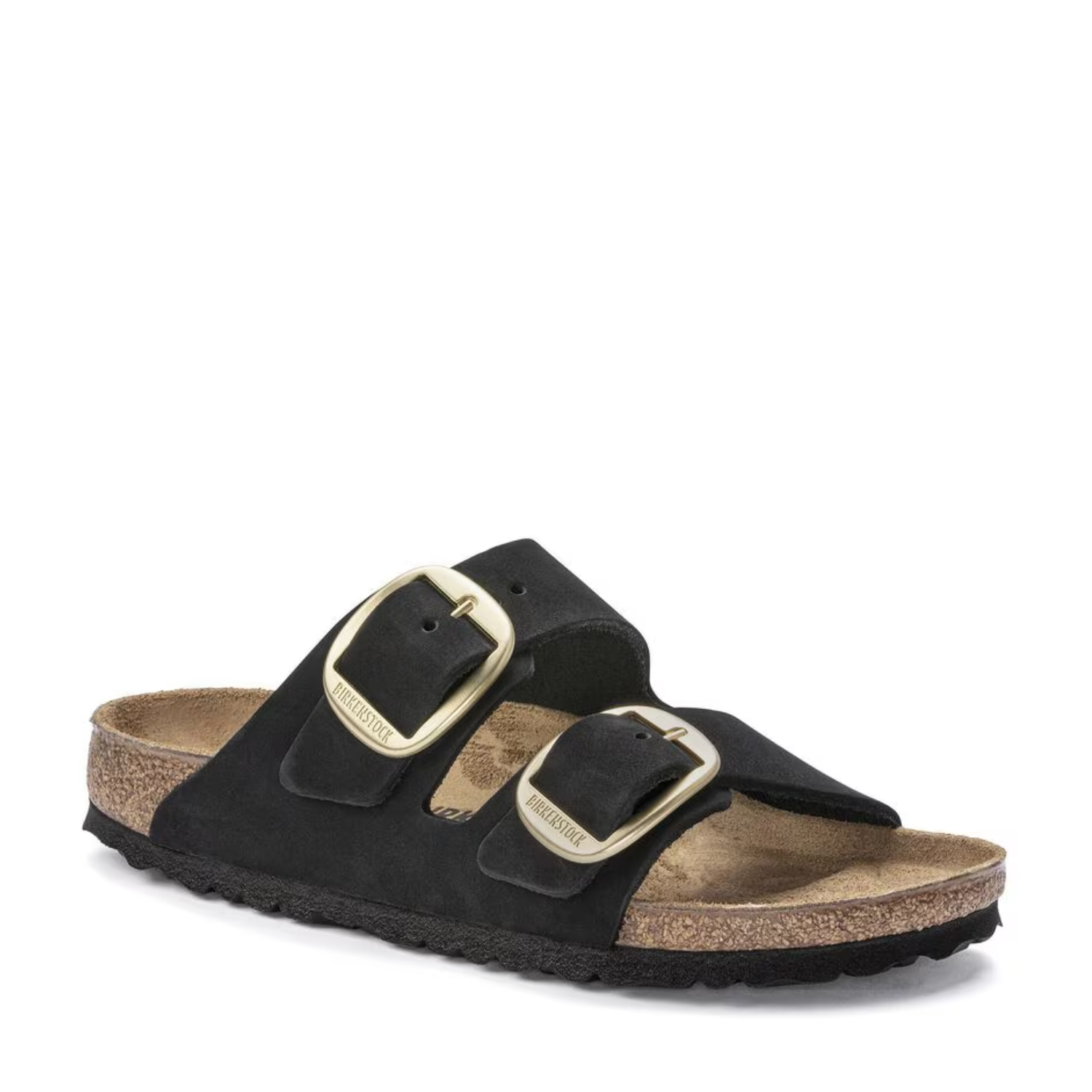 Birkenstock Black Arizona Big Buckle. Black sandals, Big Buckle version features a large, elegant pin buckle, a beautiful detail that stands out on these very simple sandals. The upper is made of high-quality nubuck leather, which looks great with its natural, rustic look.