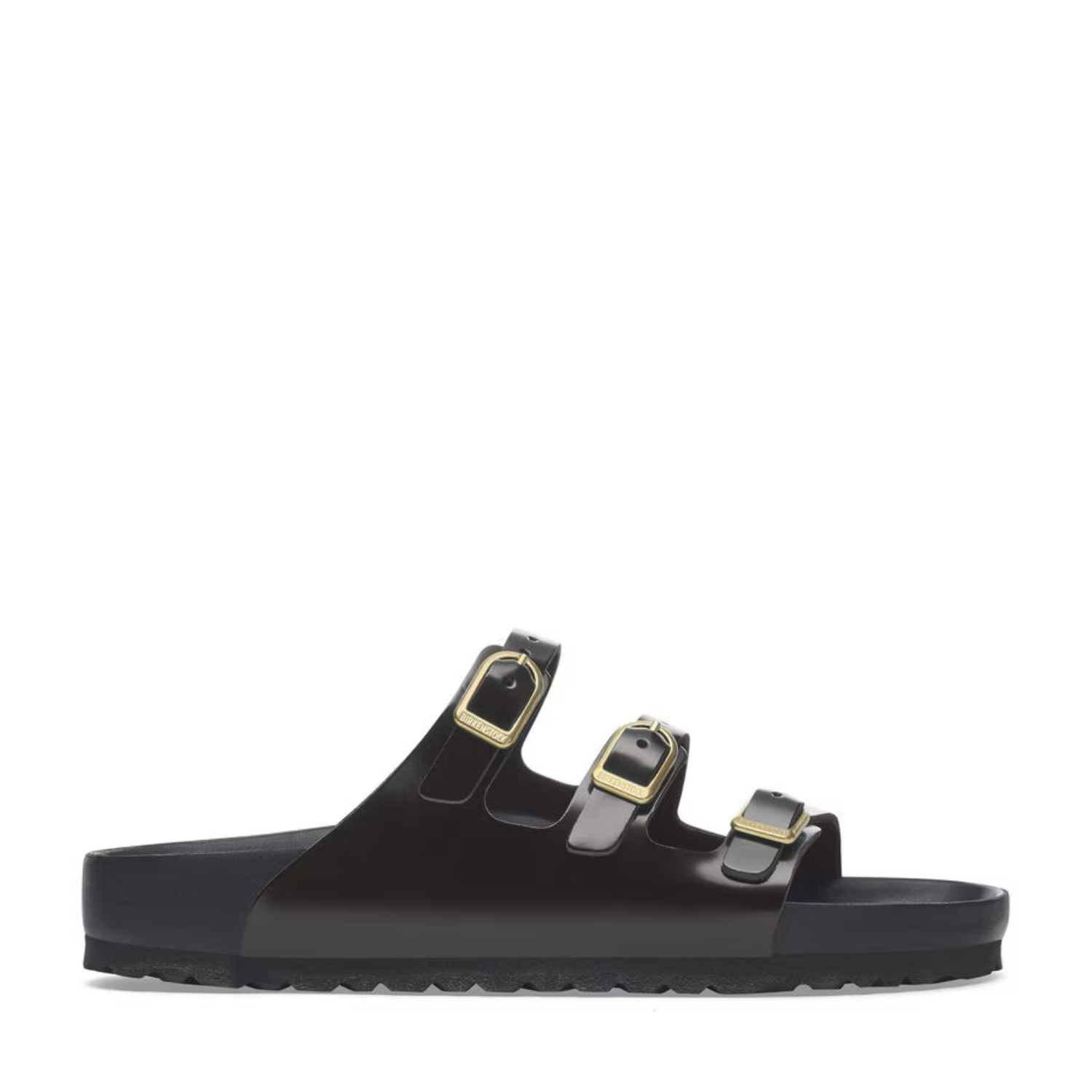 Birkenstock Florida Fresh Black Sandals. Black natural patent leather sandals with three straps with individually adjustable metal pin buckles, feathered leather, natural leather with lacquered finish.