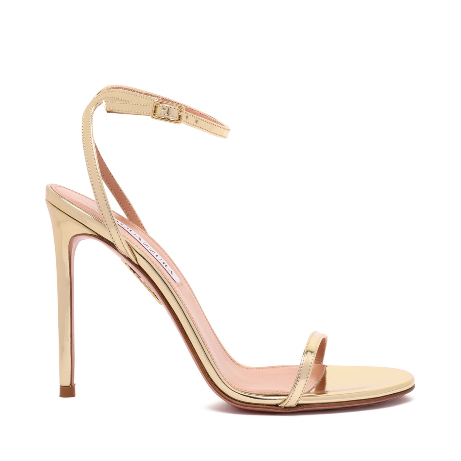 Aquazzura Olie Sandal 105. Shine without compromise. The Olie sandals strike the right balance between clean lines and a luxurious aesthetic: the slender design with a 105 mm high thin heel has a gold varnished finish that will not go unnoticed.