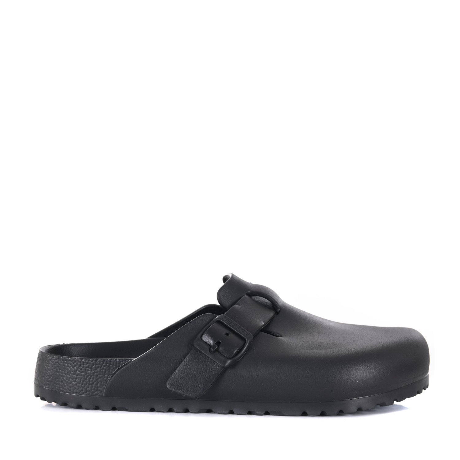 Birkenstock Black Boston Rubber Clogs. Boston clog in black rubber with adjustable strap with tone-on-tone buckle. Anatomical "regular fit" footbed, EVA rubber sole.