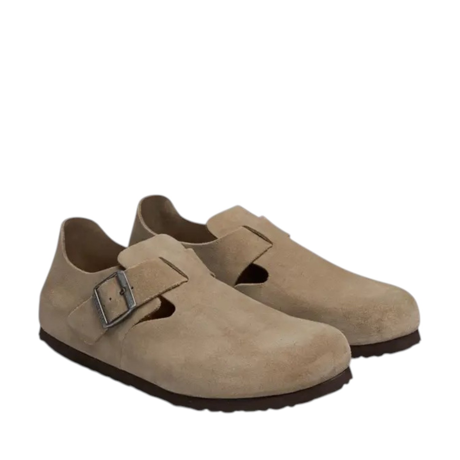 Birkenstock Taupe London SL Sandals. Taupe sandals made with layers of suede and jute, which conform to the shape of their wearers’ feet.