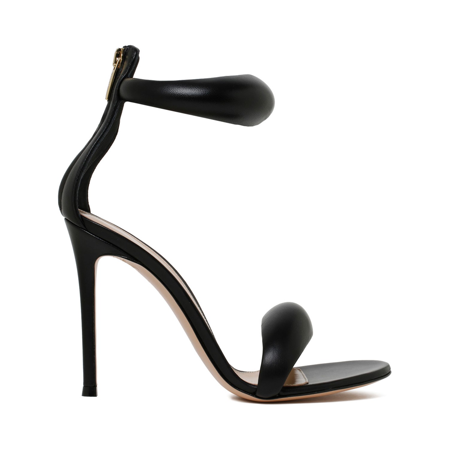 Gianvito Rossi Black Bijoux Sandals. Black calf leather sandals, grained texture, round open toe, single toe strap. Ankle strap, rear zip fastening, branded leather insole.