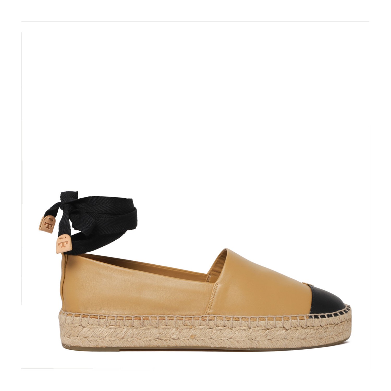 Tory Burch Pointed Espadrilles. Ginger shortbread nappa leather espadrilles with metal stud with logo, jute sole and sole. Nappa lining, translucent rubber sole, cotton laces with leather ends at the ankle.