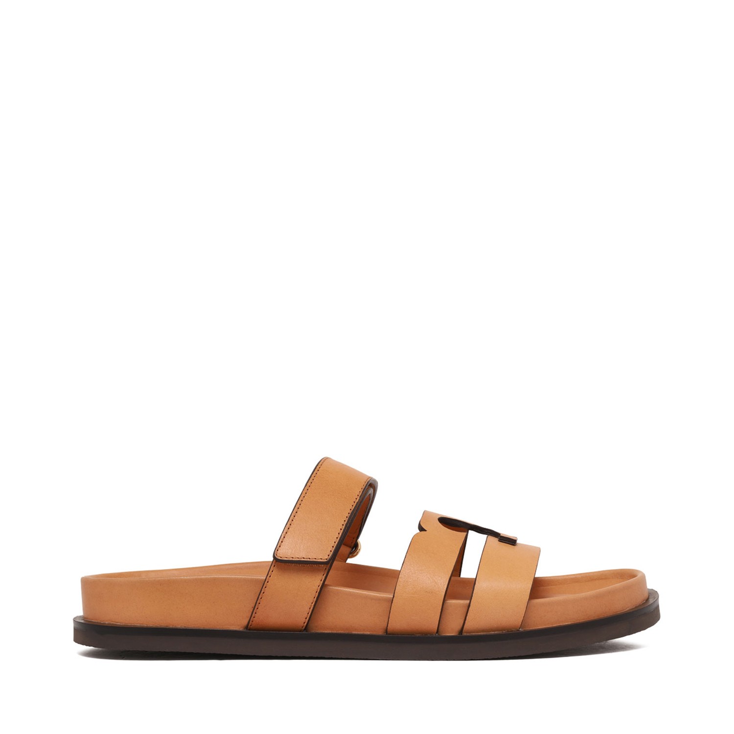 Tory Burch Caramel Brown Ines Slides. Caramel brown leather slides with touch-strap fastening, two strap design, decorative logo detail. Open toe and flat sole.