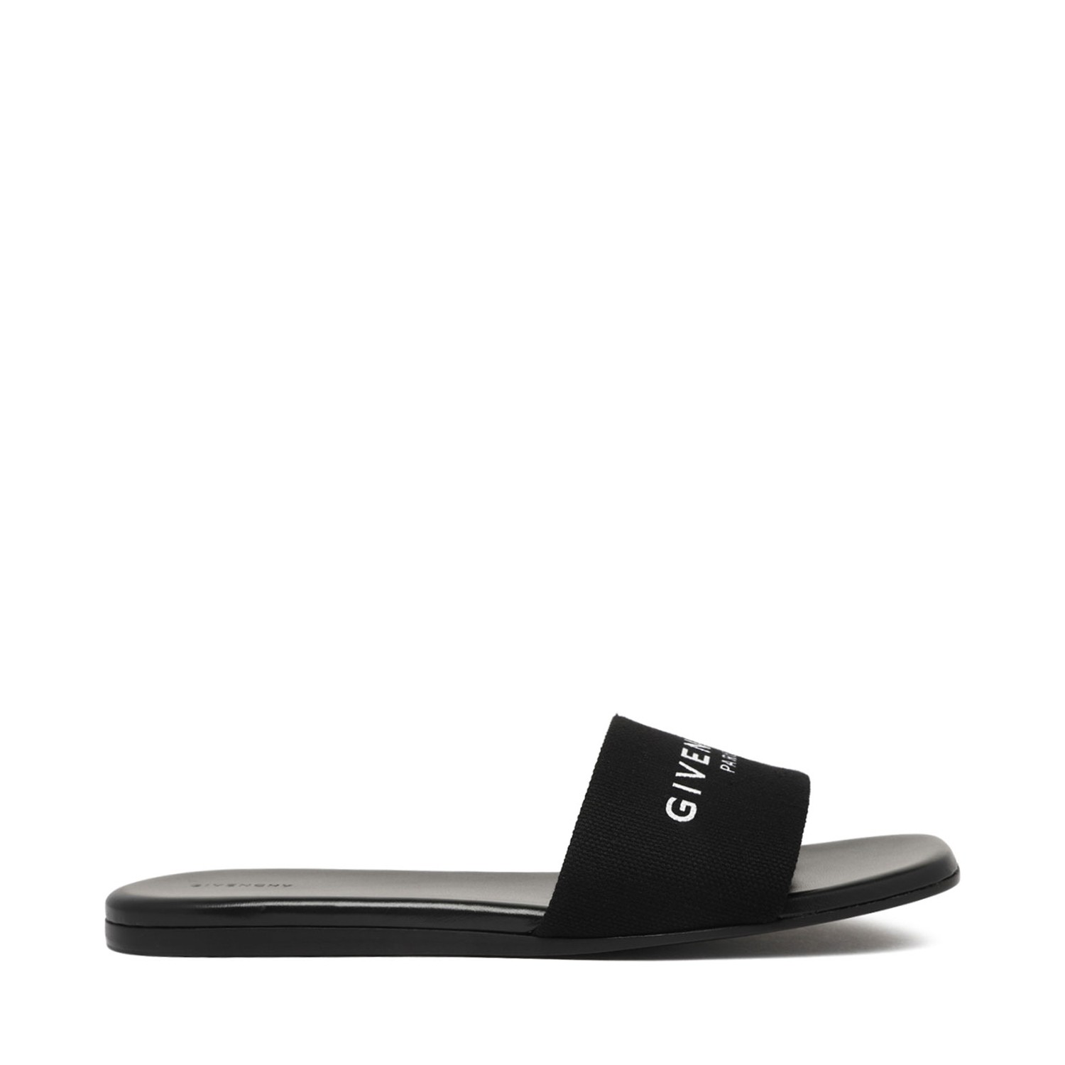 Givenchy Black 4G Slide Sandals. Black canvas slide sandals, contrasting logo lettering print, slip on style, round toe, open toe, leather sole.