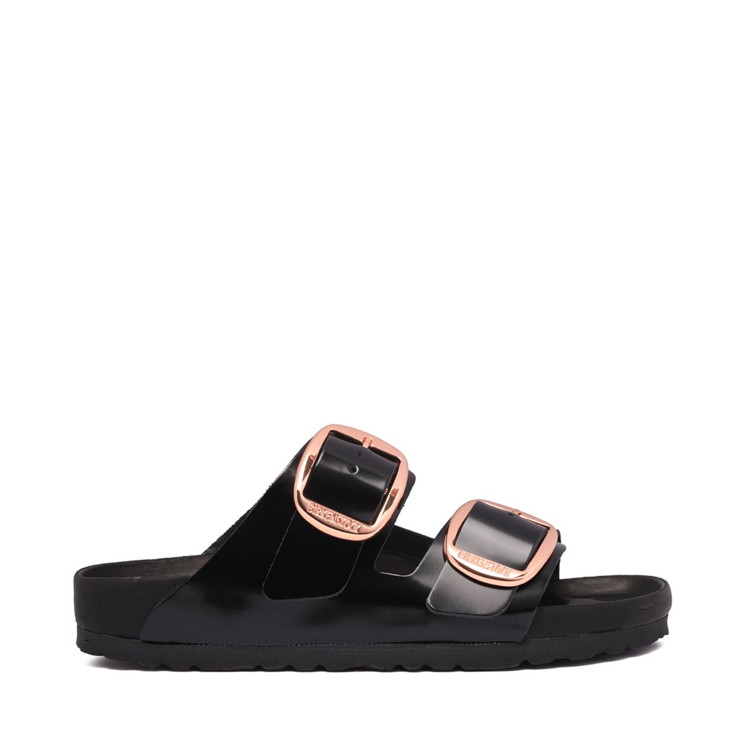 Birkenstock Black Arizona Big Buckle Sandals. Black leather sandals with round open toe, double-strap design, double buckle fastening. EVA midsole and cork sole.