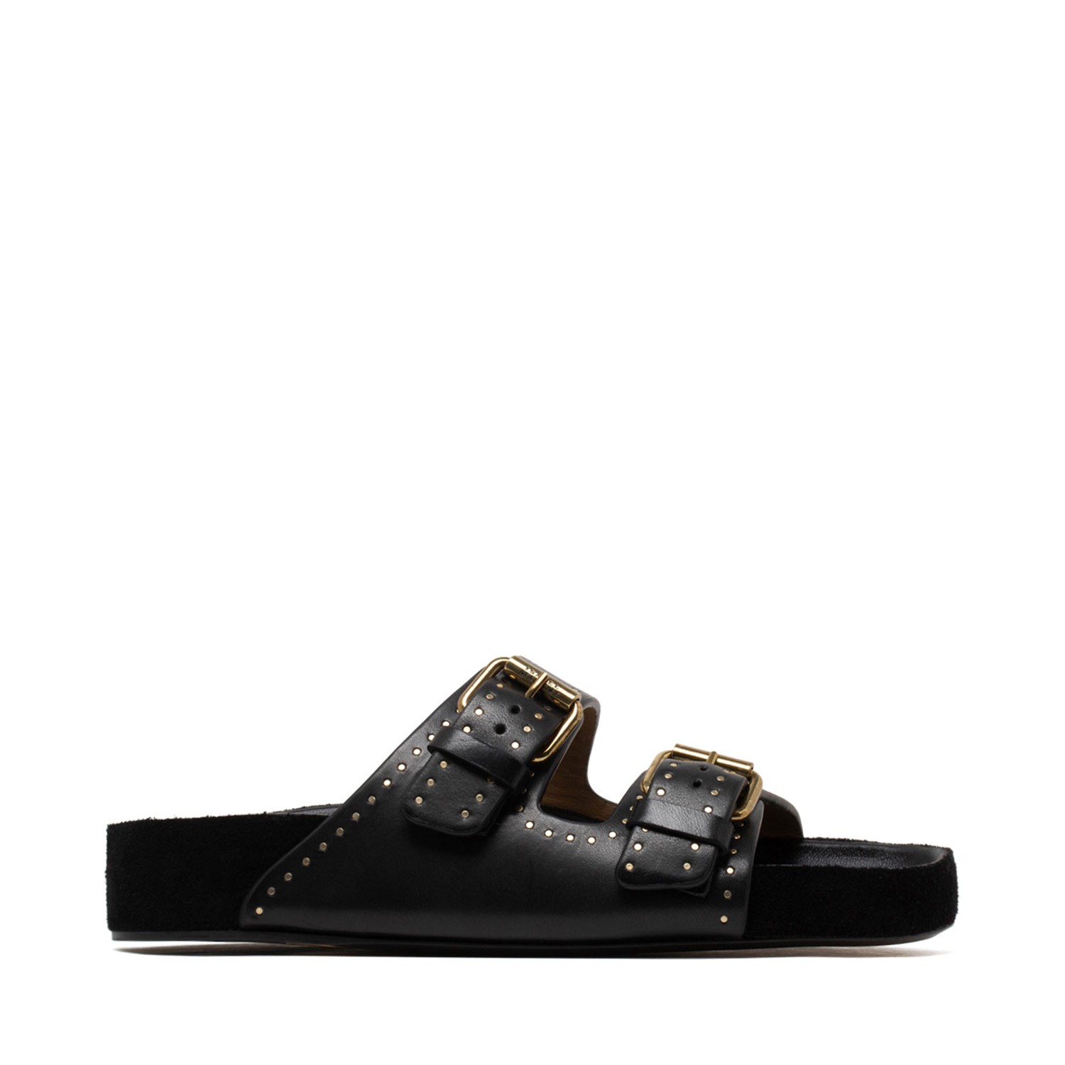 Isabel Marant Black Lennyo Sandals. Black studded leather buckle sandals, double buckle closure, leather sole.