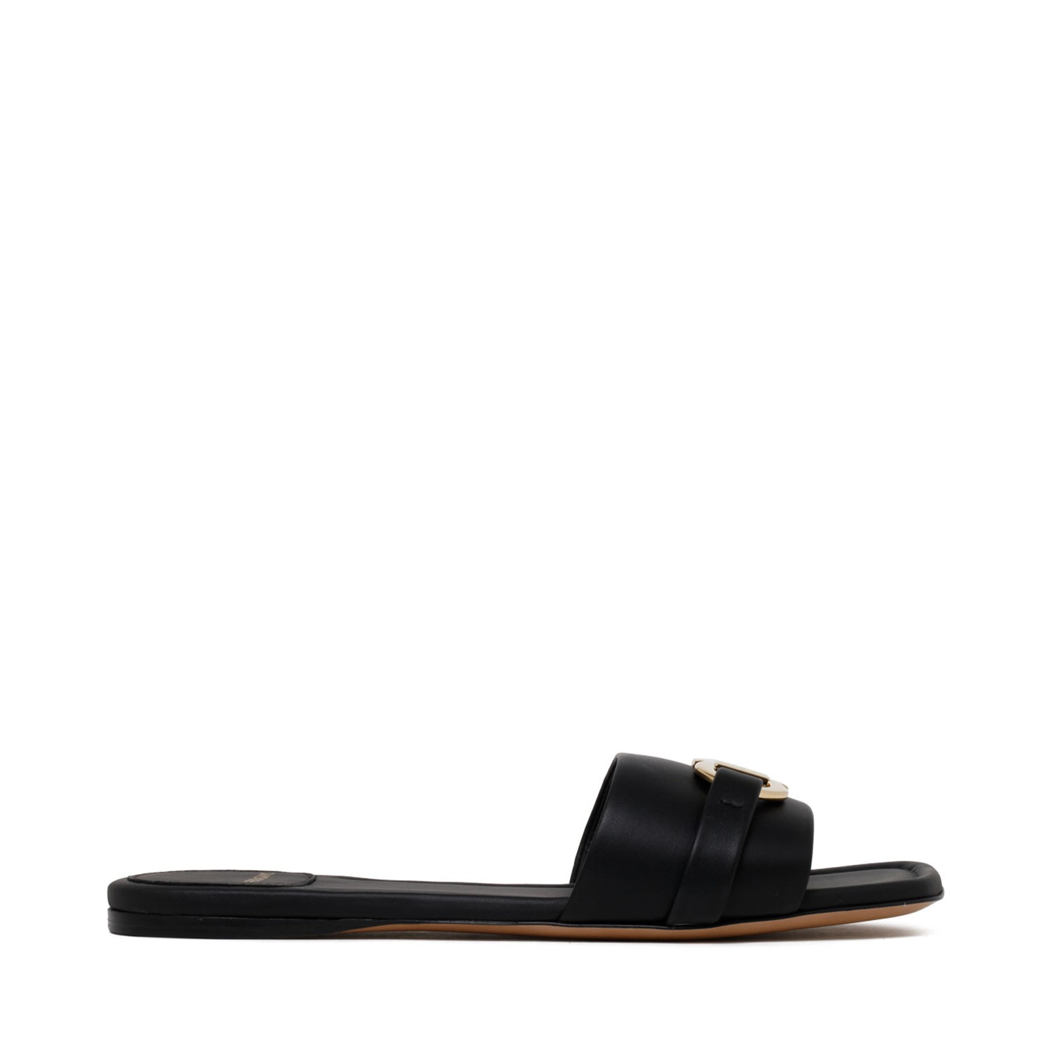 Ferragamo Squared-off Flat Slide made of smooth calfskin features a wide band on the toes with Gancini gold ornament with a squared profile, padded leather insole and stitching detail that emphasizes the shape. 1 cm heel made with fluid construction.
