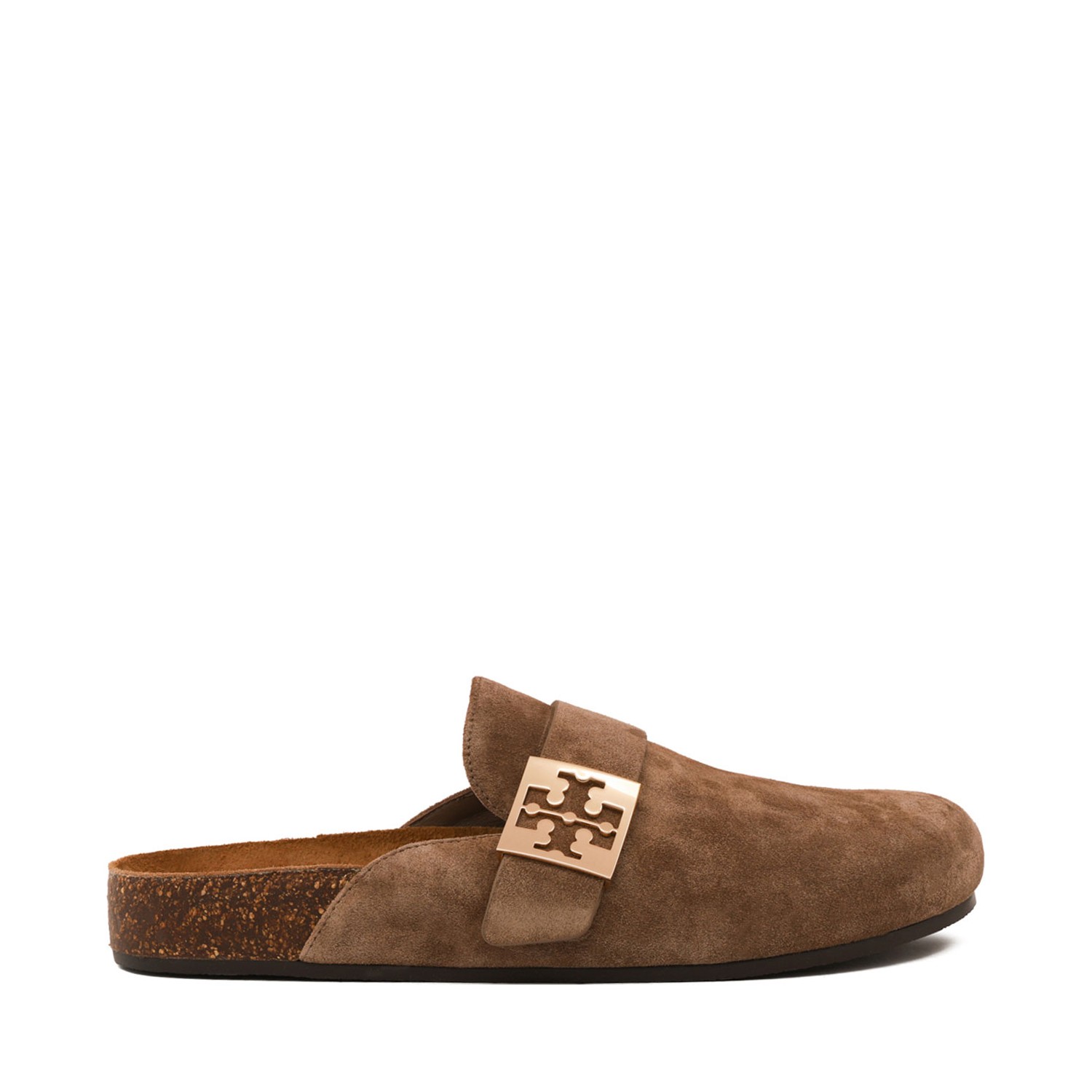 Tory Burch Beige Mellow Mule. Beige suede mule with strap with metal details, cork sole covered in suede. Nappa lining and rubber sole.