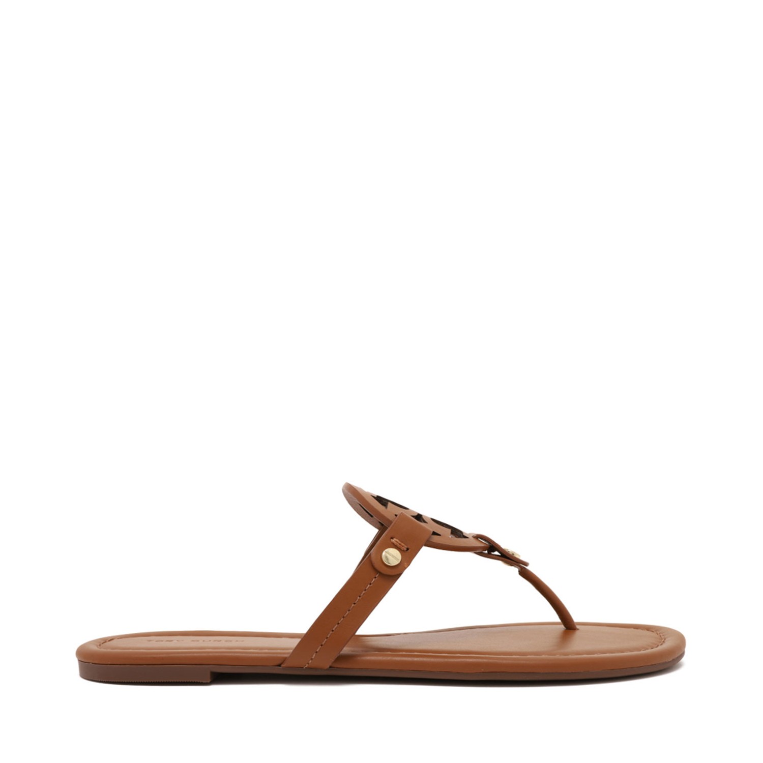 Tory Burch Vintage Vachetta Miller Sandals. Vintage vachetta Laser-cut design, front logo patch, toe strap, leather insole with logo, rubber outsole, and slip-on design.
