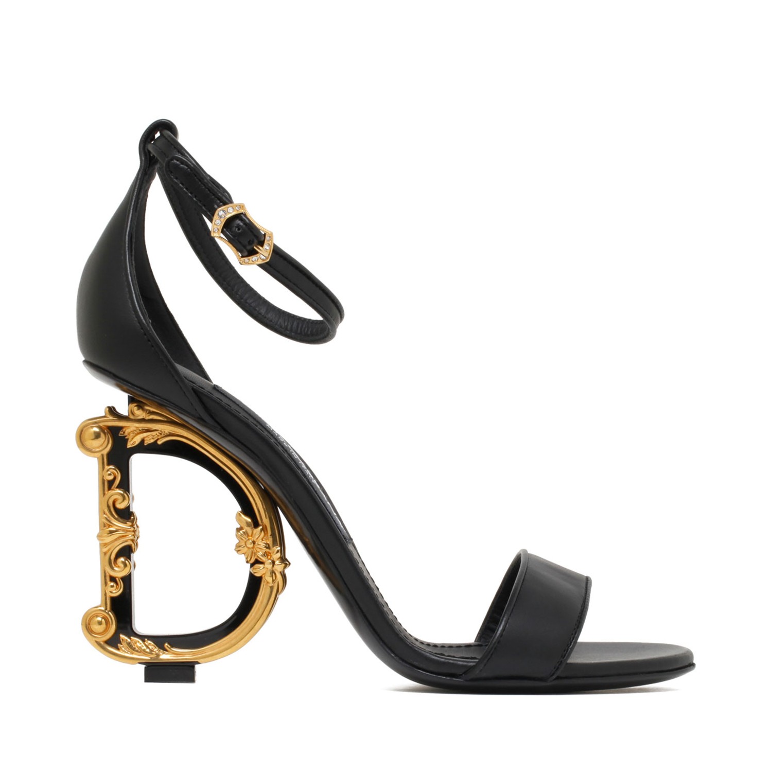 Dolce & Gabbana Black Leather Sandals. Black iconic sandals in soft nappa leather feature the sculptural baroque DG heel. Strap with bejewelled buckle in vintage plated brass, kidskin insole with branded label, branded leather sole.