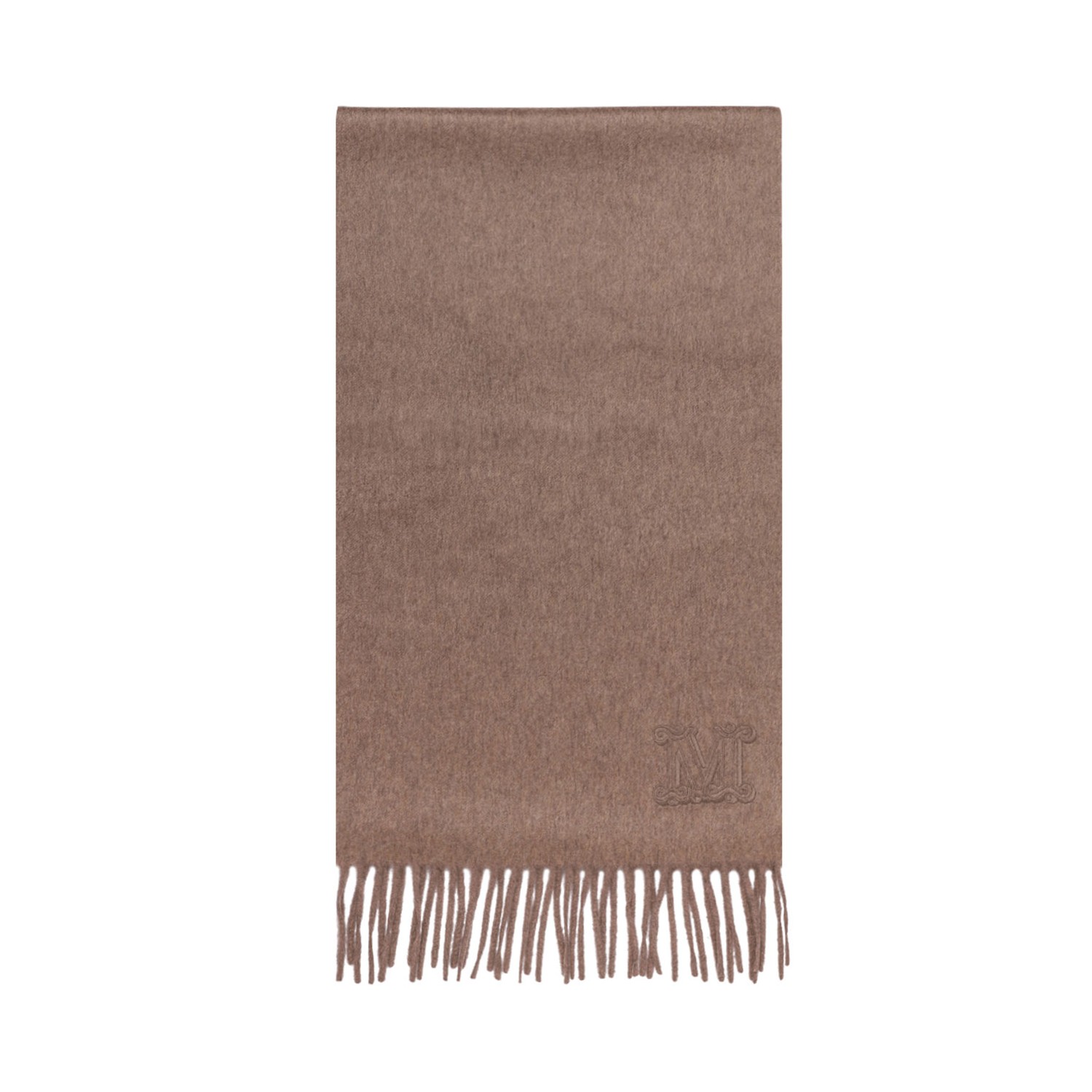 Max Mara Dark Beige Cashmere Stole. Stole with an essential design, embellished with an elegant M Monogram detail embroidered in tone on the bottom. Stole in pure sable cashmere yarn. Fringed motif on the short sides.