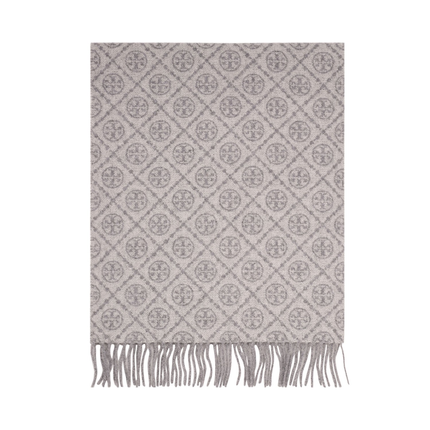 Tory Burch Gray Long T Monogram Scarf. Gray wool and cashmere long scarf with jacquard knit logo, reversible, double layer. Fringes braided at the bottom and top edges.