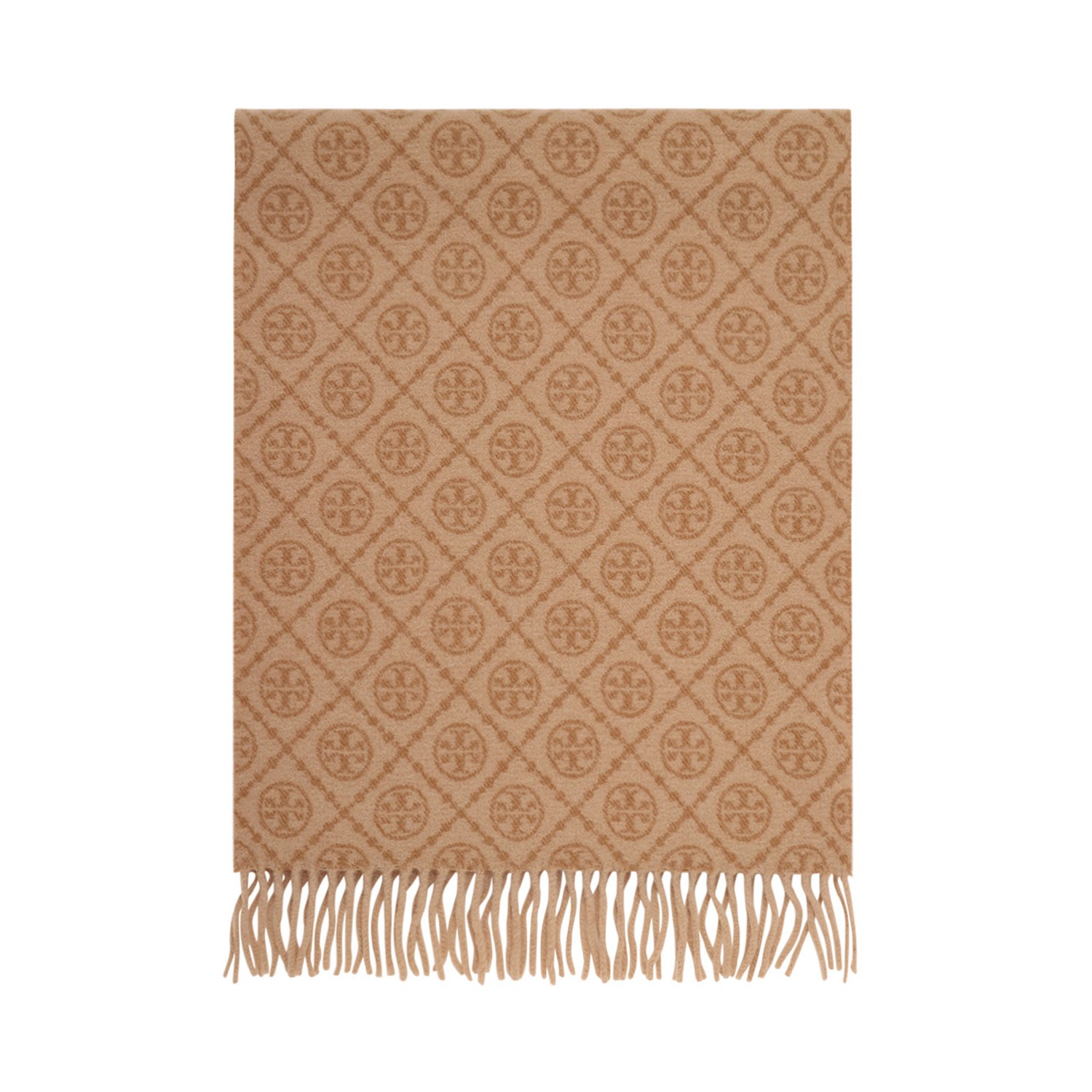Tory Burch Camel Long T Monogram Scarf. Camel wool and cashmere long scarf with jacquard knit logo, reversible, double layer. Fringes braided at the bottom and top edges.