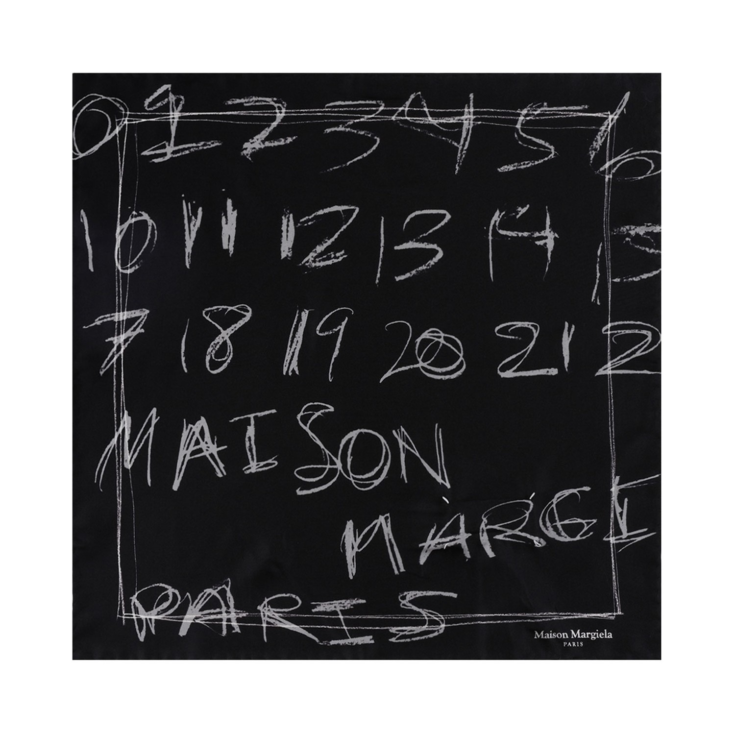 Maison Margiela Black Scribbled Numerical Silk Foulard. Black silk foulard with an oversized scribble effect, sketch-like motif.