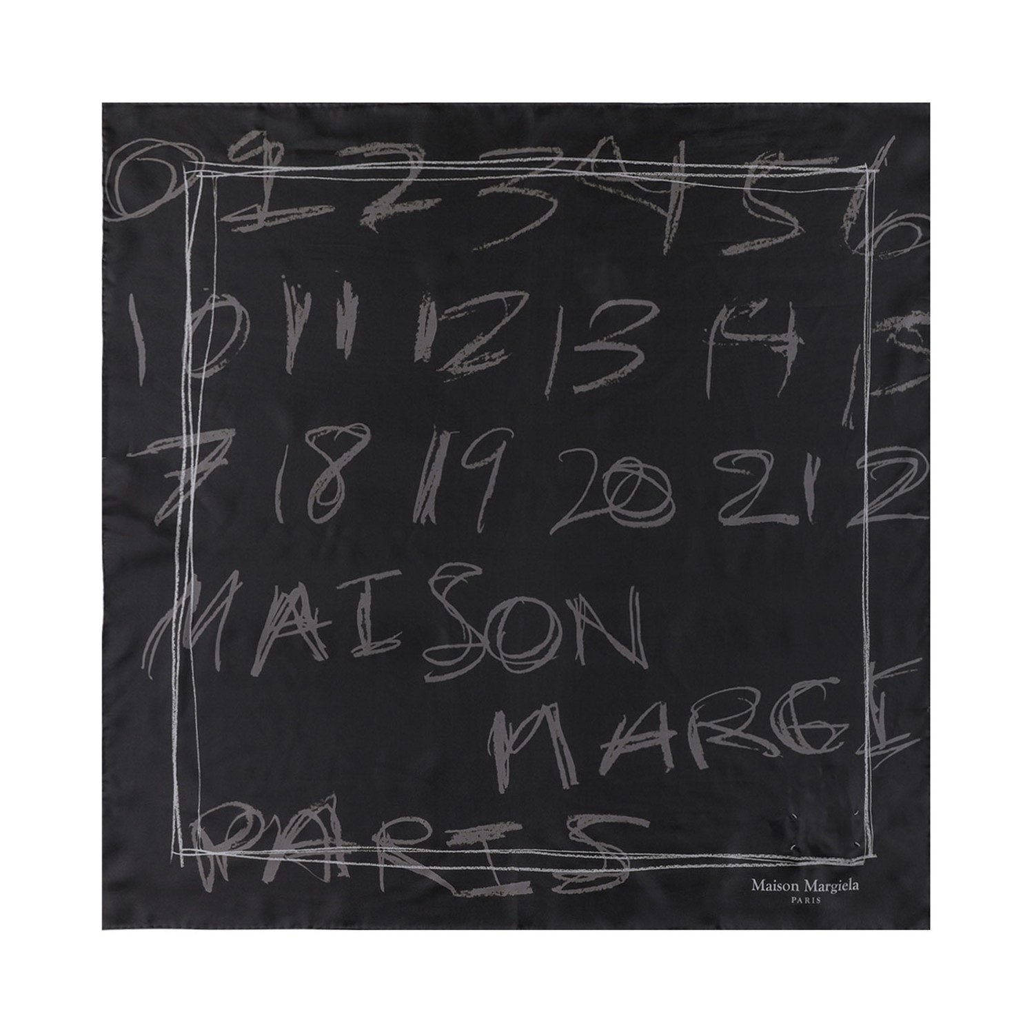 Maison Margiela Graphite Scribbled Numerical Silk Foulard. Graphite silk foulard carries the Maison�s numeric artwork in a hand-drawn, scribbled treatment. Rendered in tonal contrast, the print shifts graphic clarity into spontaneous gesture, transforming an emblem into texture. A versatile accessory for layering.