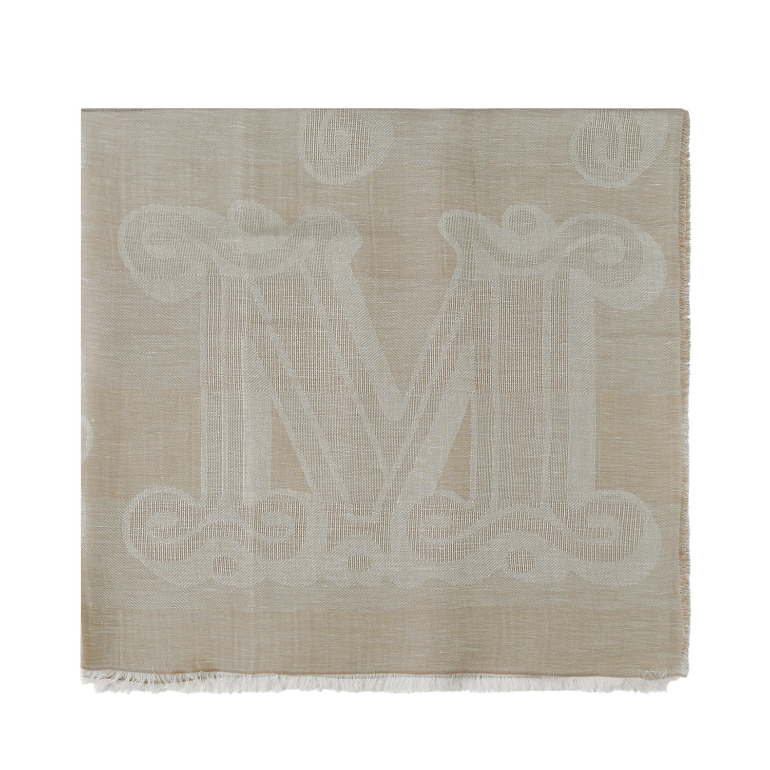 Max Mara Ivory White Logo Inlay Stole. Ivory white stole defined by a lightweight texture and refined two-tone design. Crafted in a soft modal, linen and cotton blend, this Max Mara scarf combines breathable comfort with a fluid, airy drape. The elegant logo inlay motif creates subtle contrast and depth, enhancing the sophisticated aesthetic while maintaining a minimalist appeal. Finished with delicate fringed edges, it adds movement and a touch of effortless elegance. The generous rectangular silhouette allows versatile styling, whether wrapped around the neck or draped over the shoulders. Made in Italy with meticulous craftsmanship, it is a timeless accessory perfect for refined everyday wear and elevated seasonal layering.