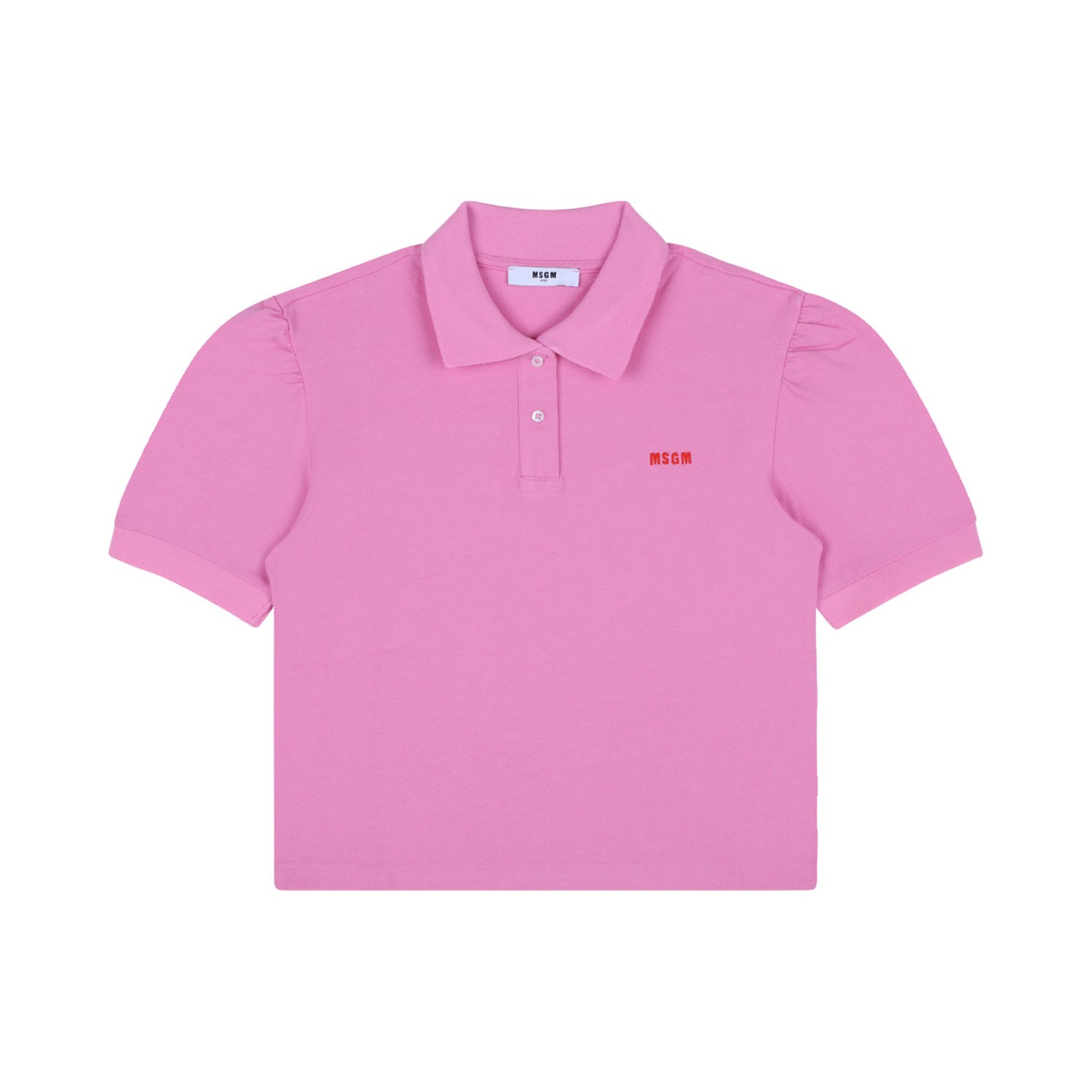 MSGM Kids Pink Pique Polo Shirt. Pink cotton polo shirt with front button placket, short puff sleeves, ribbed cuffs, embroidered logo at the chest.