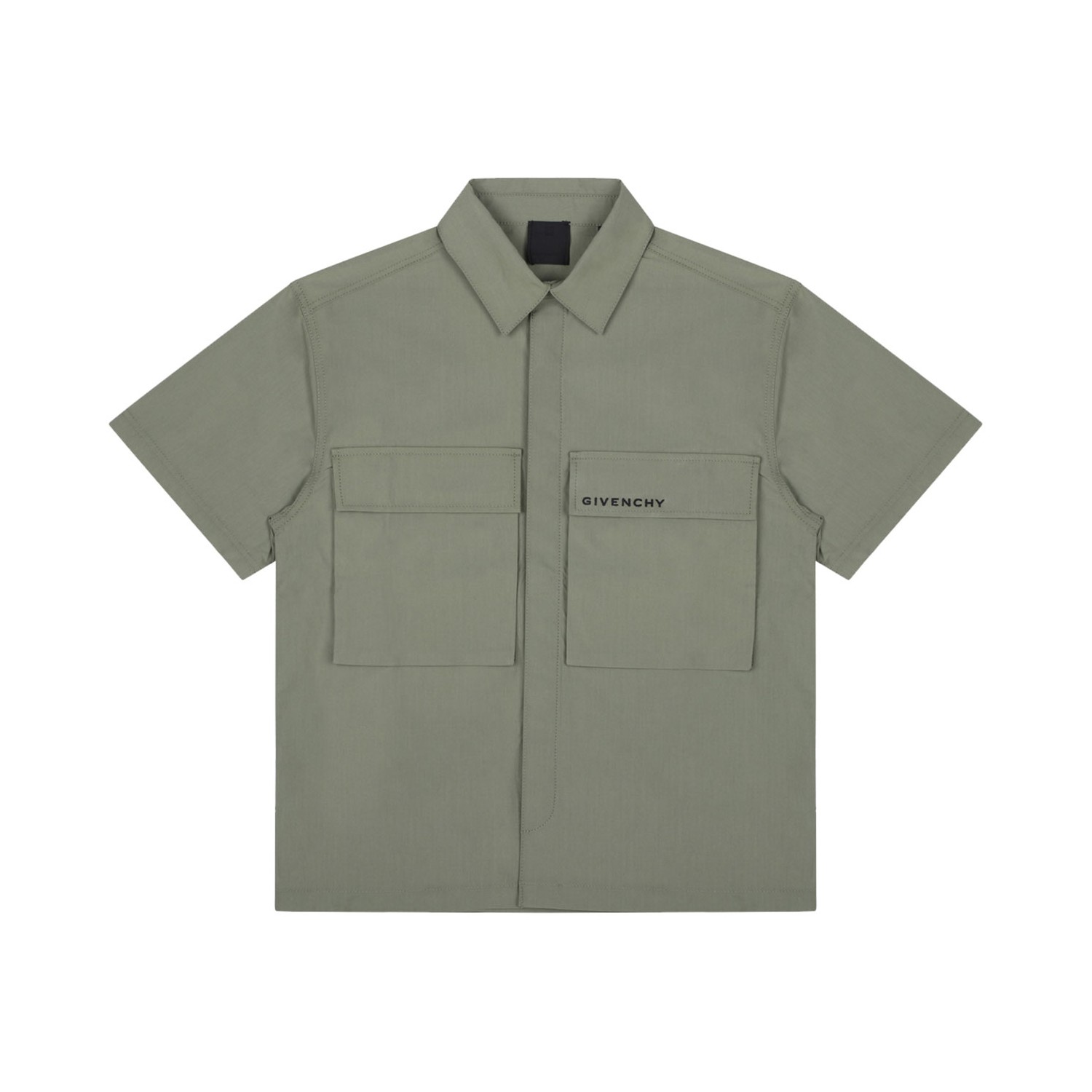 Givenchy Kids Olive Green Shirt. Olive green cotton shirt with embroidered logo at the chest, concealed front button fastening. Classic collar, two chest patch pockets, short sleeves.