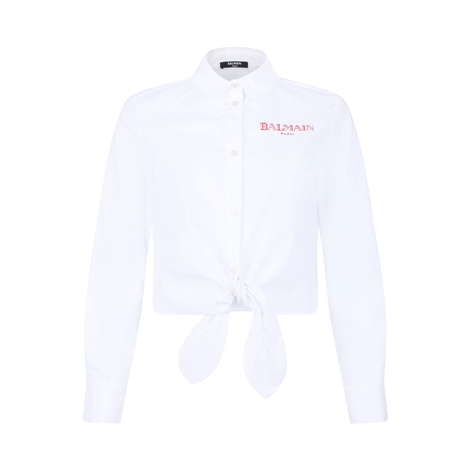 Balmain Kids White Knot Detail Shirt. White cotton shirt with knot detail, front button placket, buttoned cuffs. Embroidered logo at the chest, cropped.