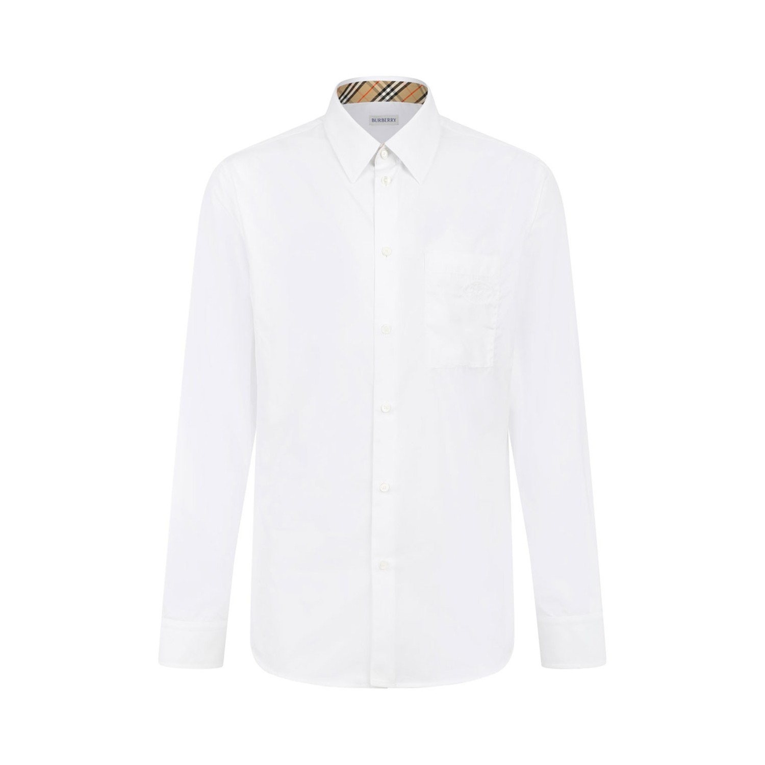 Burberry White Cotton Poplin Shirt. A shirt in Italian-woven cotton poplin, cut to a regular fit. The style is embroidered with a tonal Knight stamp, an archival motif first seen on Burberry bags in the 1980s. Roll back the cuffs to reveal the Burberry Check lining.