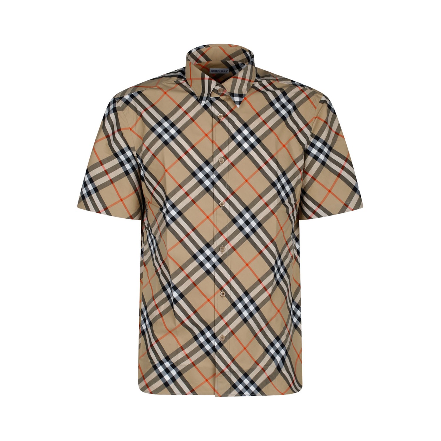Burberry Check Shirt. Sand cotton poplin shirt, short sleeves, button closure, point collar, curved hem.