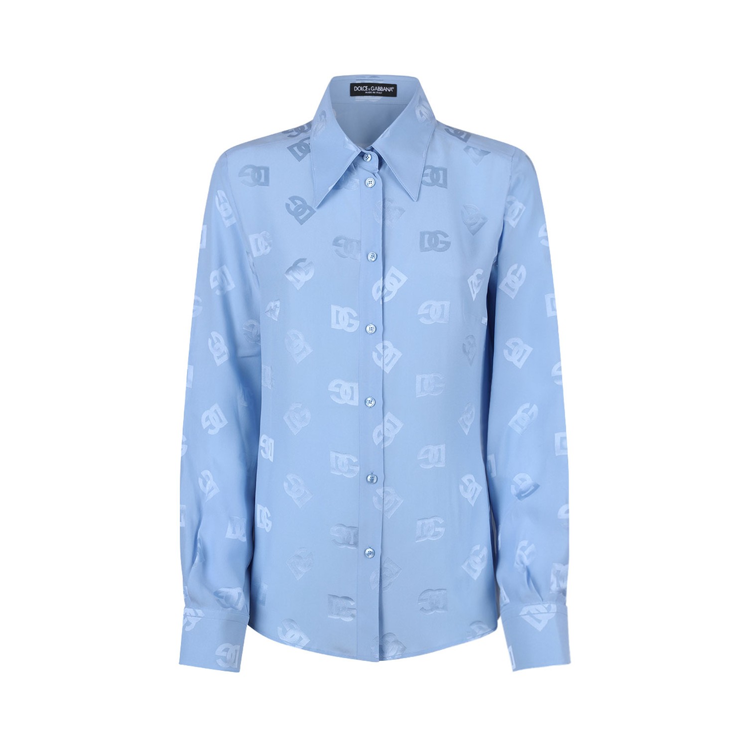 Dolce & Gabbana Jacquard Silk Shirt. Light blue jacquard silk satin shirt with allover DG logo, long sleeves, slim fit, button fastening with logoed bottom.