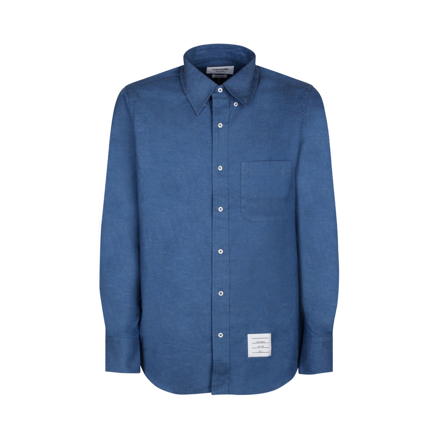 Thom Browne Deep Blue Cotton Logo Patch Denim Shirt. Deep blue cotton denim shirt, front press-stud fastening, long sleeves, rear stripe detailing, classic collar.