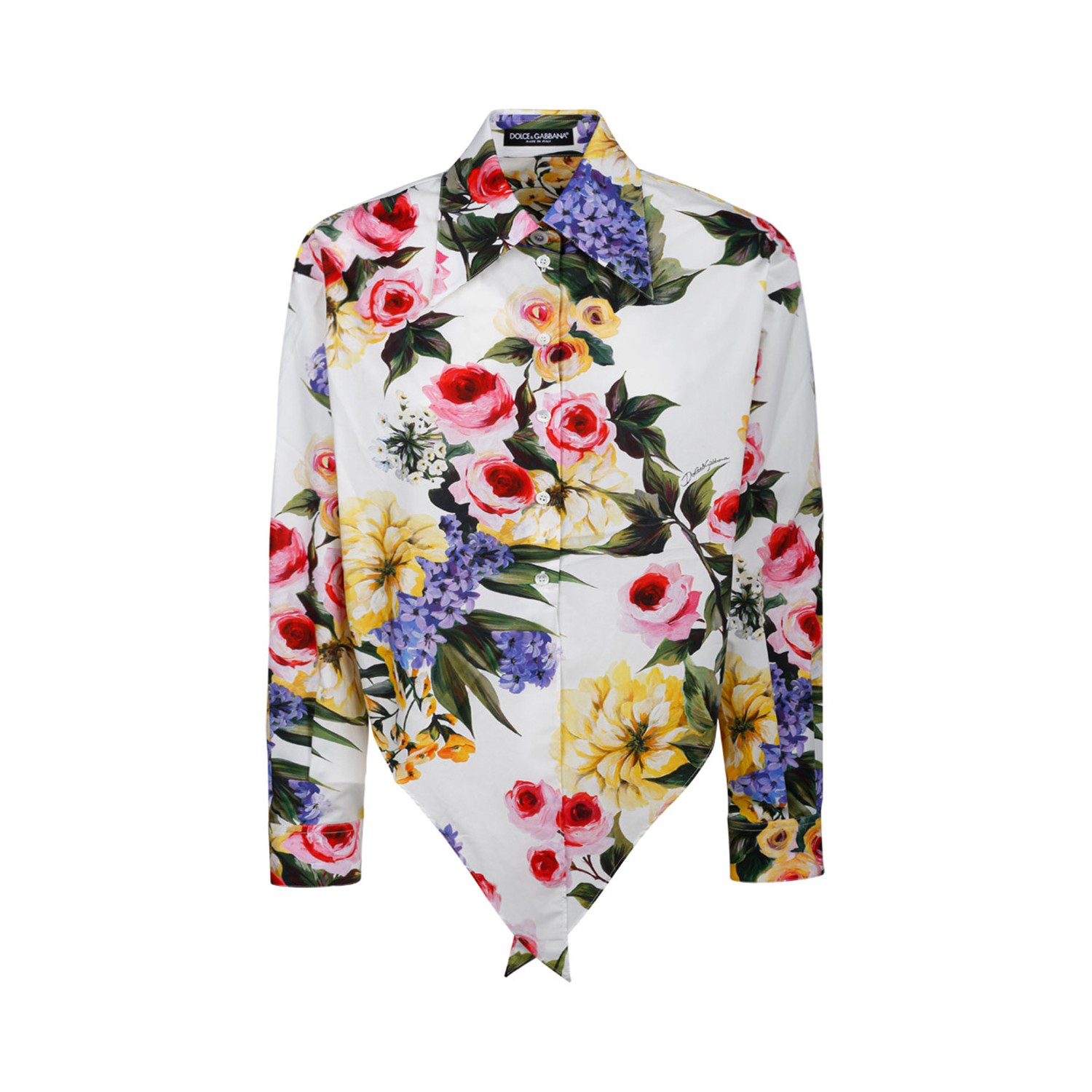 Dolce & Gabbana Multi-coloured Garden Print Shirt. Multi-coloured short cotton poplin shirt, shirt collar, short sleeves, cropped fit. Buton fastening with branded bottom edge, garden print.
