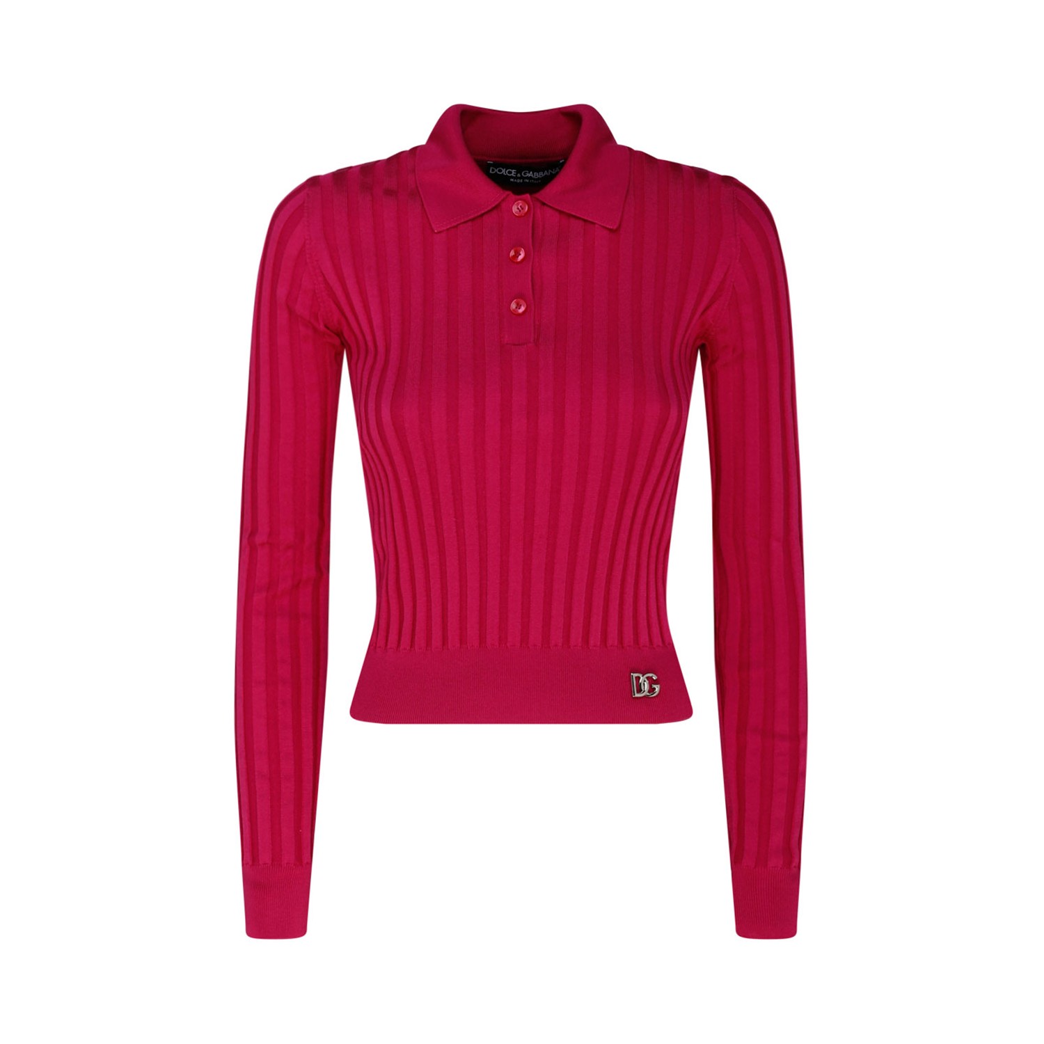 Dolce & Gabbana Fuchsia Silk Cropped Polo Shirt. Fuchsia silk polo shirt, polo collar, front button fastening, logo detail on the buttom, long sleeves, ribbed edges.