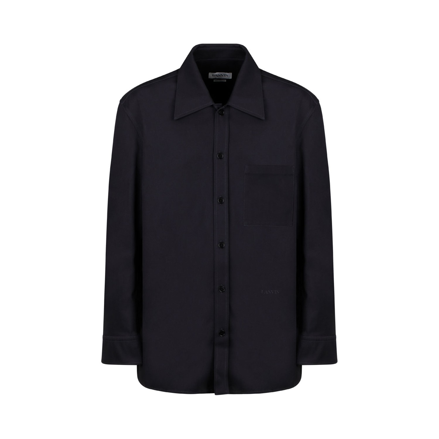Lanvin Steel Oversized Shirt. Steel oversized cocoon style shirt, lapel collar, soft unstructured shoulders. Long sleeves with single button placket at cuffs, button front closure, patch pocket on the chest.
